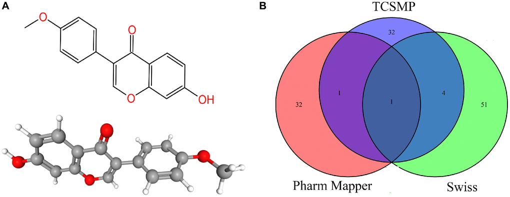 Target proteins that interact with bioactive molecules of formononetin were obtained from TCMSP, DrugBanK (https://go.drugbank.com/), Pharm Mapper (https://pubchem.ncbi.nlm.nih.gov/), and Swiss databases (http://www.swisstargetprediction.ch/). We used the full name of the target protein to obtain the corresponding gene abbreviation via UniProt ID in the UniProt database. Intersection targets screened from the three databases were considered potential target protein targets.