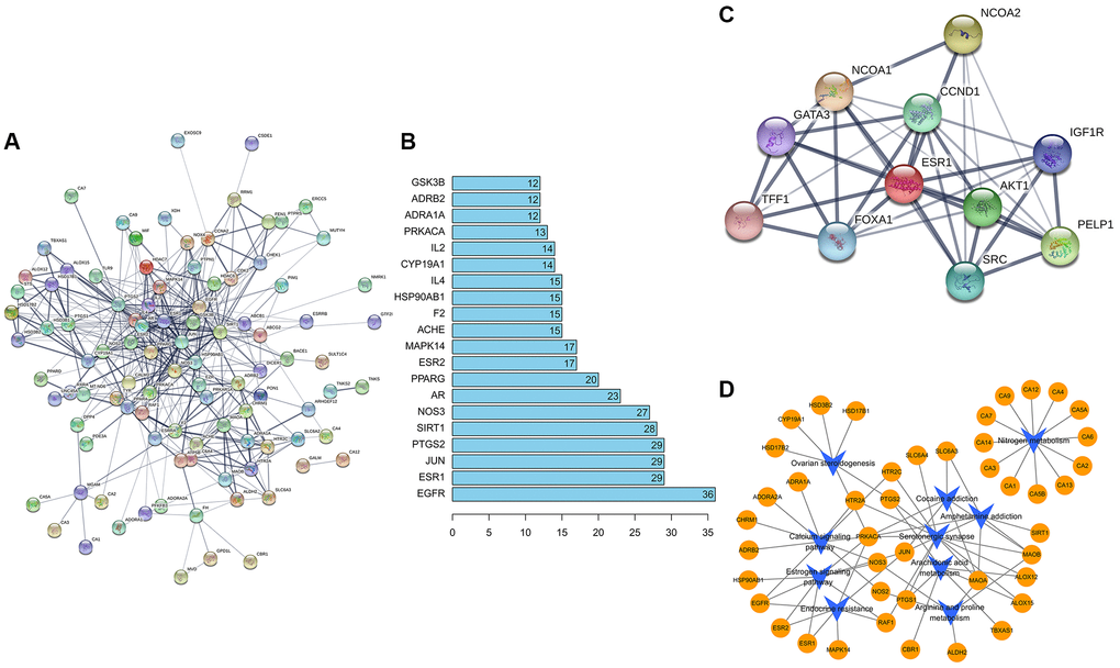 STRING database was used to draw a PPI network diagram of the targets (Figure 3A), which presented both direct and indirect regulatory relationships between targets. PPI network diagram comprised 121 nodes and 406 edges (PPI enrichment p-value < 1.0e−16). The average node degree is 6.71. The average local clustering coefficient is 0.493. The expected number of edges is 193. The nodes represent proteins, and the connections represent interactions between proteins. The more connections there are, the greater the degree of connection. The abscissa depicted 20 gene relationship pairs in the network diagram, including EGFR, ESR1, JUN, PTGS2, SIRT1, NOS3, AR, PPARG, ESR2, MAPK14, ACHE, F2, HSP90AB1, IL4, CYP19A1, IL2, PRKACA, ADRA1A, ADRB2, and GSK3B, in descending order of the number of related pairs of genes in the network diagram (Figure 3B). Considering ESR1 is the key target of formononetin, we also did the PPI network diagram of ESR1, and Figure 3C is the ESR1 protein interaction diagram. The PPI network diagram comprised 11 nodes and 39 edges (PPI enrichment p-value is 4e−0.5). Cytoscape software was used to draw a network diagram demonstrating the pathway regulation mechanism of formononetin on related target proteins (Figure 3D). The yellow circles indicate formononetin targets, and the blue arrows indicate the KEGG pathways.
