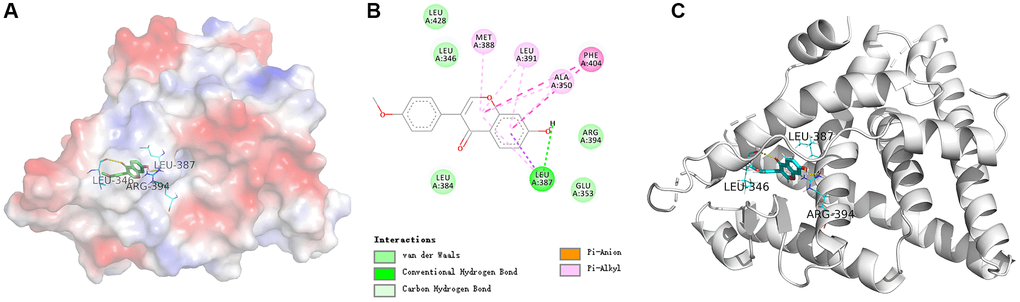 In order to study the key target ESR1 deeper, the molecular docking verification of SATB2 and formononetin was performed. In a schematic diagram of docking of ESR1 protein and formononetin (Figure 4A–4C), the affinity between formononetin and the ESR1 target protein is −7.7 kcal/mol, indicating a strong interaction between ligand and receptor. The formononetin ligand forms a hydrogen bond with three residues in ESR1 protein, namely, ARG-394, LEU-346, and LEU-387.