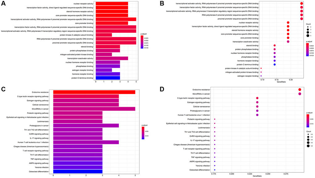 We performed GO enrichment analysis (Figure 6A, 6B) and KEGG enrichment analysis (Figure 6C, 6D) on 21 prediction targets common to formononetin anti-OS through the David website and KEGG. Only the top 20 GO IDs are shown. These targets were involved in Endocrine resistance pathways, MicroRNAs in the cancer pathway, C-type lectin receptor signaling pathway, Estrogen signaling pathway, and Cellular senescence pathway.