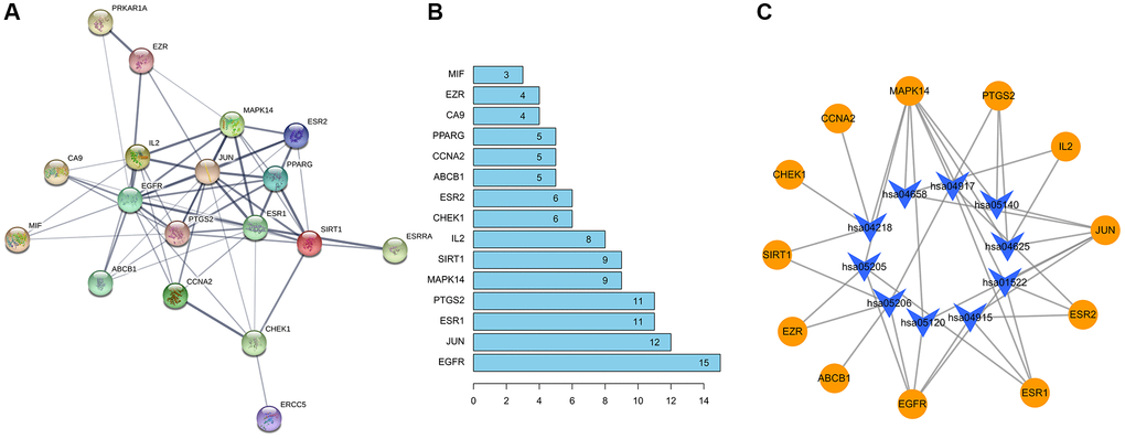 STRING database was used to draw a PPI network diagram of the targets (Figure 7A) demonstrating direct and indirect regulatory relationships between targets. The Number of nodes is 21. The Number of edges is 59. The average node degree is 5.62. Average local clustering coefficient is 0.648. The expected number of edges is 19. PPI enrichment p-value is 3.86e−13. The nodes represent proteins, and the connections represent interactions between proteins. The more connections there are, the greater the degree of connection. In core gene analysis results (Figure 7B), the abscissa depicted 15 gene relationship pairs in the network diagram, namely EGFR, JUN, ESR1, PTGS2, MAPK14, SIRT1, IL2, CHEK1, ESR2, ABCB1, CCNA2, PPARG, CA9, EZR, MIF in descending order of the number of related pairs of genes in the network diagram. Cytoscape software was used to draw a pharmacology network diagram demonstrating the pathway regulation mechanism of formononetin-OS-related protein targets based on KEGG pathway analysis (Figure 7C). The yellow circles indicate formononetin-OS prediction targets, and the blue arrows indicate the KEGG pathways.