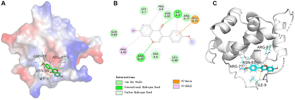 In order to study the key target SATB2 further, the molecular docking verification of SATB2 and formononetin was performed. In a schematic diagram of docking of SATB2 protein and formononetin (Figure 8), the affinity between formononetin and SATB2 target protein was −7 kcal/mol, indicating a strong interaction between SATB2 and formononetin. The formononetin ligand formed five hydrogen bonds with four residues in SATB2 protein, including ARG-87, ASN-81, ARG-77, and ILE-9.
