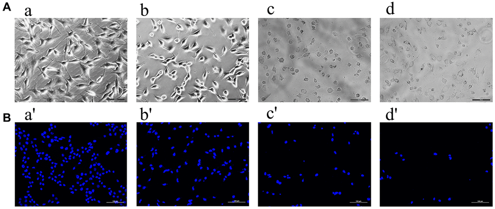 When observed under an optical microscope, MG63 cells in the control group were intact, spindle-shaped, adhered to the wall, and had unclear cell boundaries (Figure 9A (a)). Treatment with 2 μg/mL, 5 μg/mL or 8 μg/mL formononetin for 48 h induced cell apoptosis. The cells appeared shrunk and spherical (Figure 9A (b–d)). Compared with the control group, apoptosis in experimental groups increased in a concentration- dependent manner. Cells were treated with DAPI for 48 h to assess cell apoptosis. Likewise, an intact nucleus and no evidence of apoptosis was observed in no-formononetin-treated control group. However, in the experimental groups treated with 2 μg/mL, 5 μg/mL, and 8 μg/mL formononetin for 48 h, apoptosis was observed (Figure 9B (a′–d′)).