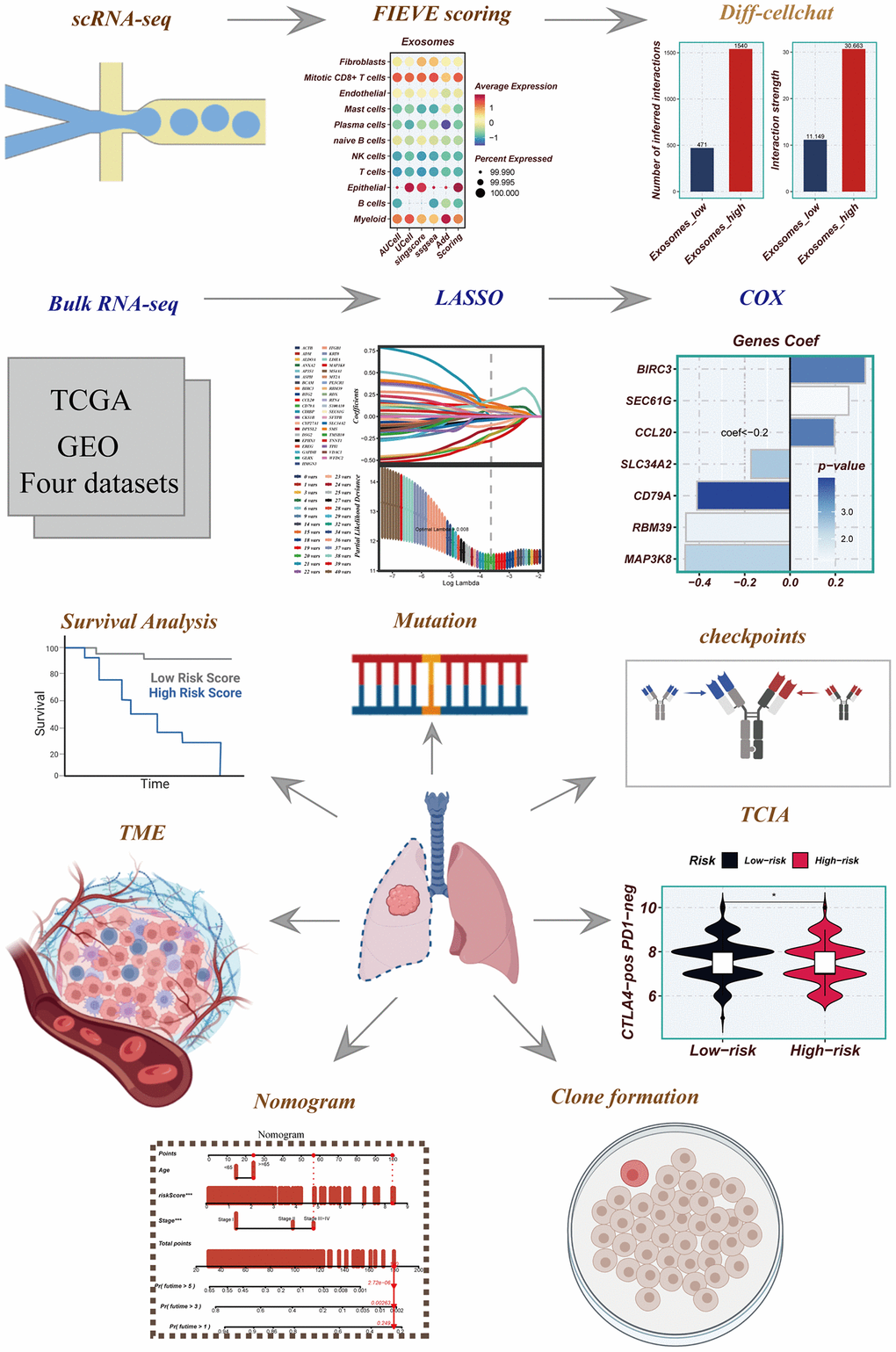 Single-cell sequencing technology, a novel sequencing technique, enables the measurement of the entire transcriptome at the single-cell resolution, allowing for the differentiation of different cell types. It can rapidly identify genetic differences between cancer and non-cancer cells, elucidate molecular mechanisms driving tumor development, and reveal somatic mutations during tumor evolution. By unraveling the heterogeneity of the TME, this method has been utilized to identify unique immune cell subpopulations potentially associated with tumor immune surveillance, thereby suggesting potential drug targets [16, 17]. Some studies have indicated that intra-tumoral heterogeneity contributes to cancer progression and enhances treatment resistance. Single-cell RNA sequencing (scRNA-seq) has been employed to assess the prognosis and drug resistance of LC, breast cancer, ovarian cancer, and gastric cancer [18, 19].
