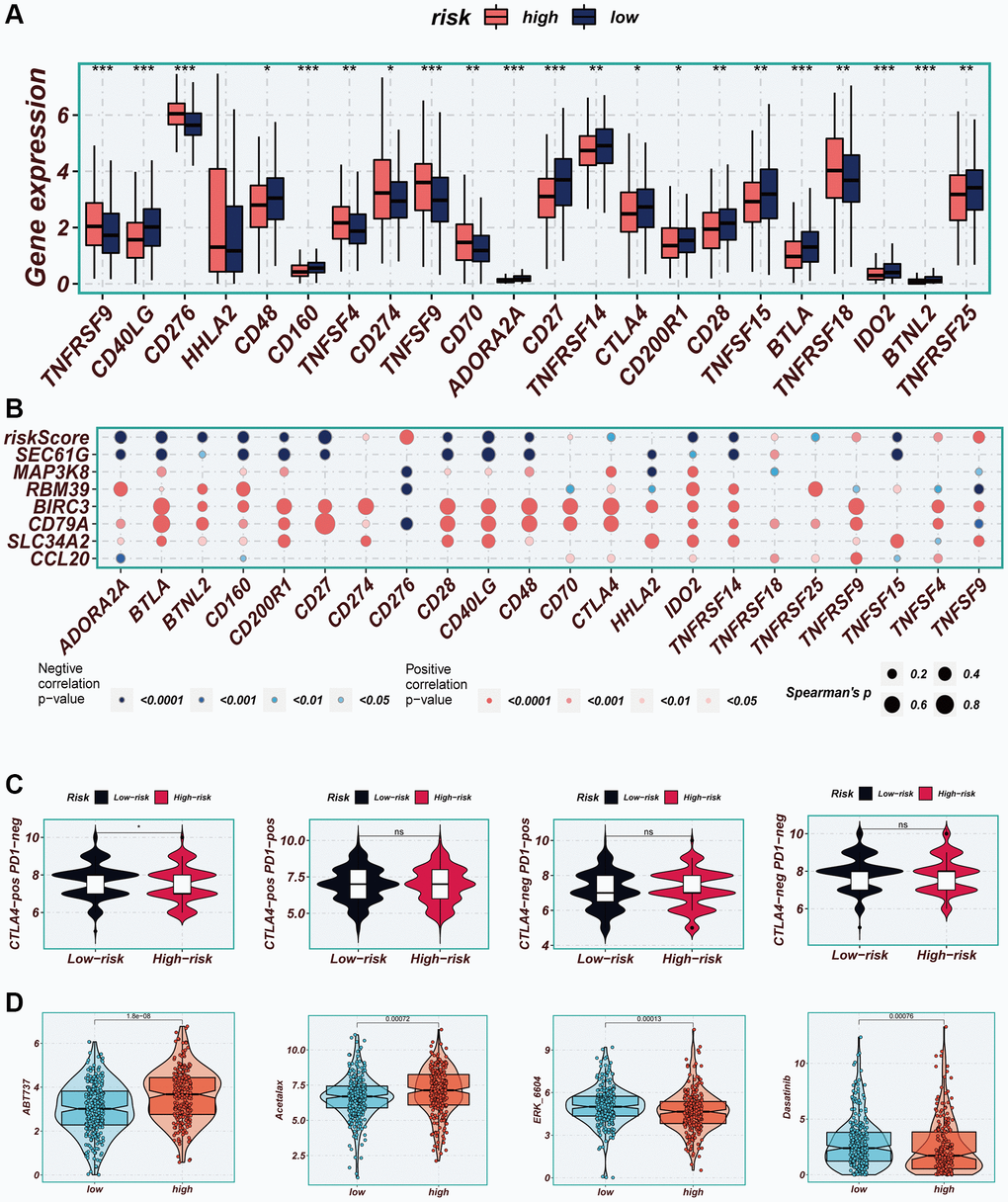 Considering the significance of immune checkpoints in the success of tumor immunotherapy, we investigated the differential expression of immune checkpoints between the two risk groups. Low-risk patients exhibited significant upregulation of thirteen immune checkpoint genes, including CD40LG, CD48, and CD27. In the high-risk group, seven immune checkpoint genes, including CD276, CD274, and CD70, were significantly elevated (Figure 10A). Correlation analysis, depicted in Figure 10B, illustrated the relationship between risk scores, model genes, and immune checkpoint gene expression. Red color indicated a positive correlation, while blue color indicated a negative correlation. It was evident that the risk score exhibited a significant negative correlation with the majority of immune checkpoint genes, such as BTLA, CD27, and CD48. Immunophenoscore (IPS) was employed to select patients likely to respond to immune therapy. In our study, we observed that low-risk patients had a higher IPS when receiving CTLA-4 immunotherapy (Figure 10C). This finding suggested that low-risk patients may demonstrate enhanced responsiveness to immune checkpoint inhibitors (ICIs) and derive greater benefits. By utilizing the “oncopredict” R package, we explored potentially effective chemotherapy drugs for both high- and low-risk groups. Our findings indicated that ABT737 and Acetalax may be more efficacious in low-risk patients, while ERK_6604 and Dasatinib may exhibit higher sensitivity in high-risk patients (Figure 10D).
