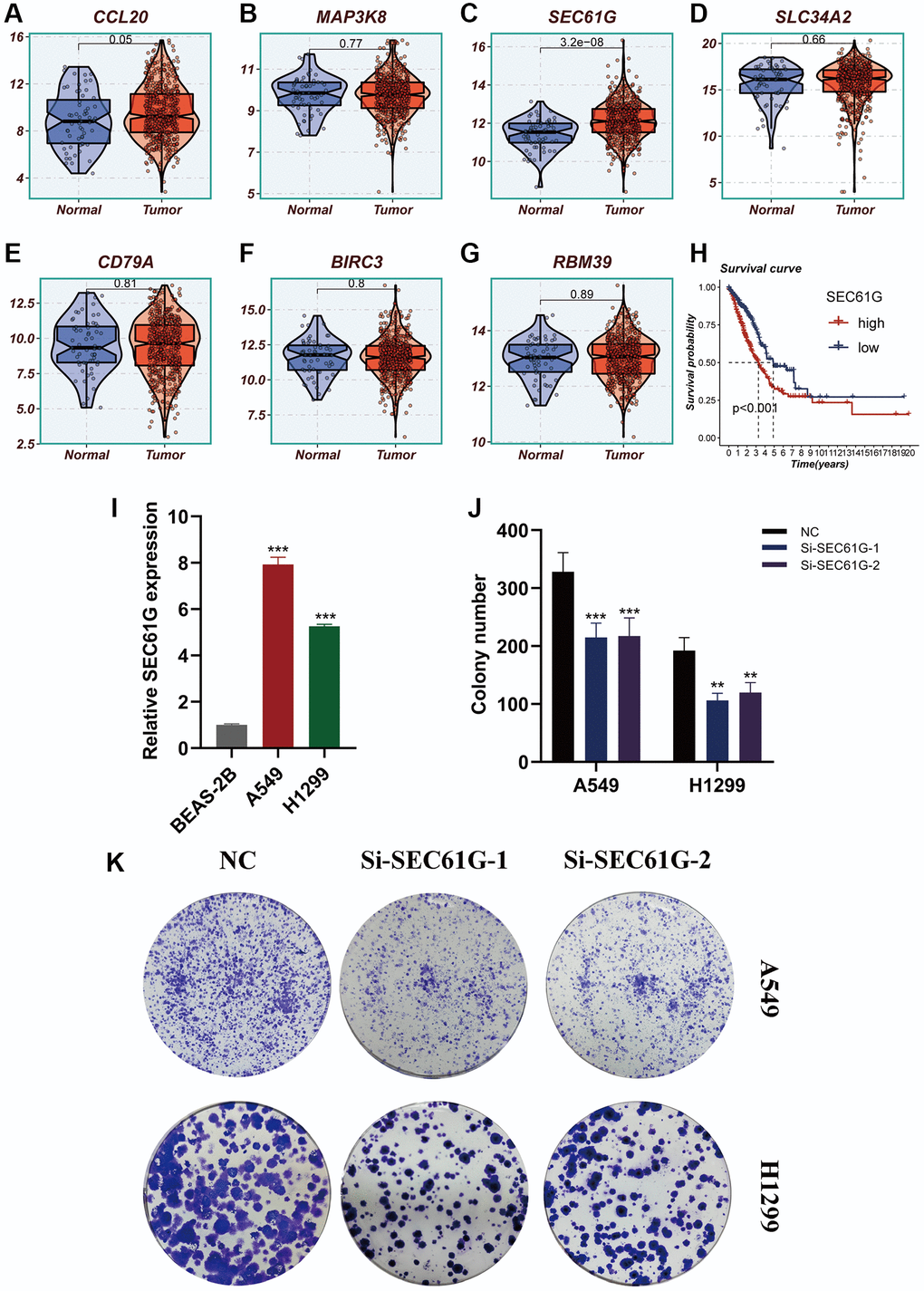 The expression differences of seven model genes were compared between tumor tissues and normal tissues, as depicted in Figure 11A–11G. Notably, high expression of SEC61G was observed in tumor tissues. Furthermore, Figure 11H illustrated that LUAD patients with high expression of SEC61G exhibited poorer survival outcomes. Additionally, the experiments demonstrated that A549 and H1299 LUAD cells exhibited higher expression of SEC61G compared to normal lung cells (Figure 11I). Downregulation of SEC61G resulted in a significant reduction in the number of cell clones within the LUAD cell lines (Figure 11J, 11K). These findings strongly suggest that high expression of SEC61G can promote the proliferation of LUAD cells.
