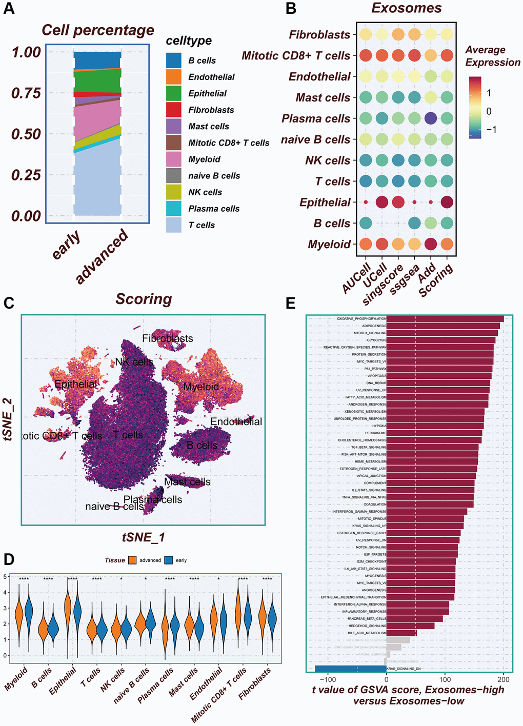 There are differences in the percentage of cells between early-stage and advanced LUAD tissues (Figure 3A). In Figure 3B, a combination of five scoring methods (including AUCell, Ucell, singscore, ssgsea, and Addmodulescore) was employed to assess exosome activity (EA), revealing that epithelial cells exhibited the highest exosome activity. The tSNE diagram displayed the exosome activity across various cell types, highlighting stronger EA in epithelial and myeloid cells (Figure 3C). Figure 3D demonstrated significant disparities in exosomal activity levels between early-stage and advanced LUAD tissues. To unravel the underlying biological mechanisms associated with the different scoring scores, the hallmark gene set was utilized to explore the pathways that exhibited significant differences between the high- and low-EA groups. The principal enrichment pathways observed in the high-EA groups included oxidative phosphorylation, adipogenesis, and the p53 pathway (Figure 3E).
