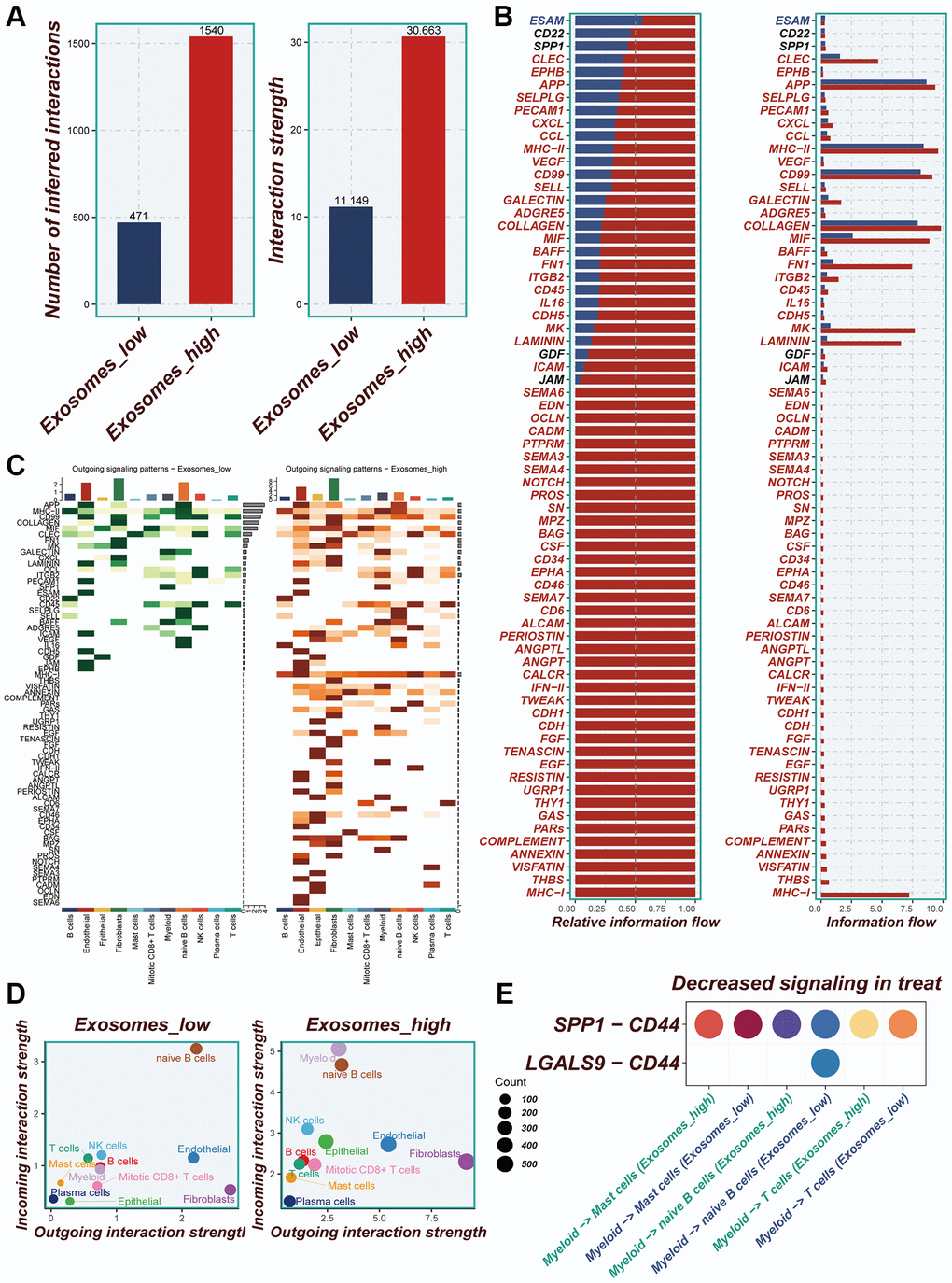 Differences in the number of cellular communications between groups with high- and low-EA groups were presented in Figure 4A and Supplementary Figure 2A, 2B. Figure 4B showed the number and percentage of various signaling pathways in the high- and low-EA. Significant differences in signals emitted between the high- and low-EA groups, with more signals active only in the high-EA group (Figure 4C). Significant alterations were also observed in the roles fulfilled by various cell types within different subgroups. In the low-EA group, both myeloid and epithelial cells exhibited weak efferent and afferent signals. However, in the high- EA group, their signaling capabilities were significantly enhanced (Figure 4D). Supplementary Figure 2C and Figure 4E unveiled significant discrepancies in the profiles of ligand-receptor pairs between the high- and low-EA groups. Notably, the SPP1-CD44 receptor-ligand pair emerged as a more crucial player in the low-EA group.