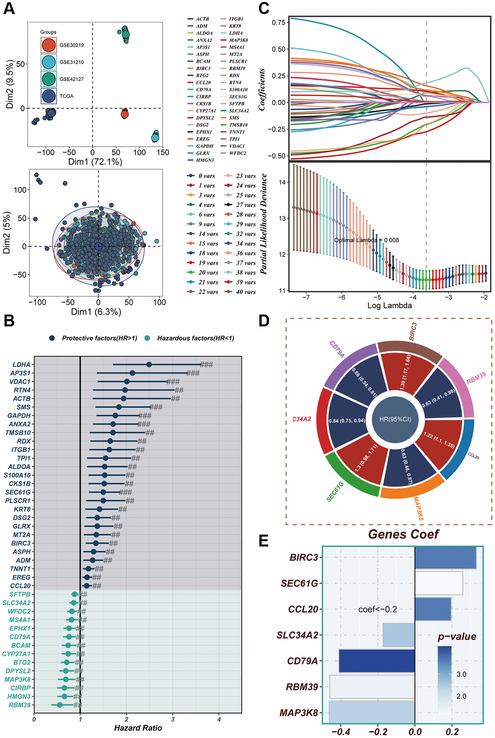 Prognostic key genes were identified through the implementation of univariate Cox regression and lasso regression analyses [27, 28]. Subsequently, a refinement process was undertaken to select the genes and determine their corresponding coefficients, utilizing multivariate Cox regression [29, 30]. The calculation of the risk score for LUAD patients was performed using the following formula: The risk score was calculated as follows: Risk score = Σ [Coef (k) × Expr (k)], where Coef (k) represents the abbreviation for regression coefficients, and Expr (k) denotes the expression level of prognostic model genes. The application of the risk score calculation was applied to the dataset’s LUAD patients, leading to their stratification into high- and low-risk groups based on the median risk score. The model’s predictive performance was assessed through the utilization of receiver operating characteristic (ROC) curves, with exceptional performance indicated by area under the curve (AUC) values surpassing 0.65. PCA analysis was employed to visually depict the distribution of patients among different risk groups.