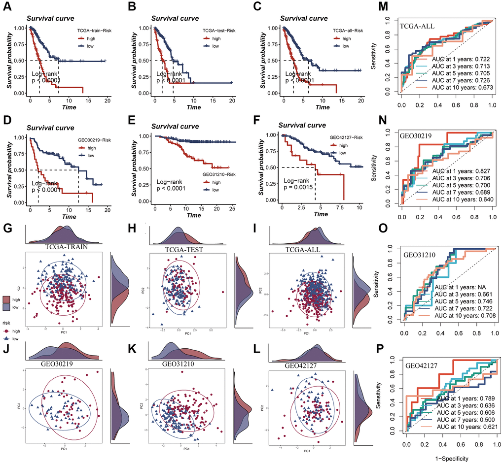 In Figure 6A–6C, it was observed that a worse prognosis was exhibited by the high-risk group in the TCGA training set, test set, and the entire cohort (P < 0.001). Additionally, a significantly poorer prognosis of patients in the high-risk group compared to the low-risk group was noted in the GEO30219 test cohort, GEO30210 test cohort, and GEO42127 test cohort (P < 0.001, Figure 6D–6F). These findings indicate that the prognostic model incorporating ERGs is highly accurate in predicting patient prognosis in both TCGA and GEO datasets. The effectiveness of the model in classifying LUAD patients into training and testing groups was demonstrated through PCA evaluation of the model for each of the seven genes in the TCGA training set, test set, and the entire cohort (Figure 6G–6I). Similar results were observed in the PCA assessment of the GEO30219 test cohort, GEO30210 test cohort, and GEO42127 test cohort (Figure 6J–6L). To further evaluate the accuracy of exosomes in assessing the prognosis of LUAD patients, ROC curve analysis was performed for the entire TCGA cohort, GEO30219 trial cohort, GEO30210 trial cohort, and GEO42127 trial cohort. The results demonstrated that good predictive performance was exhibited by the majority of the ROC curves (Figure 6M–6P).