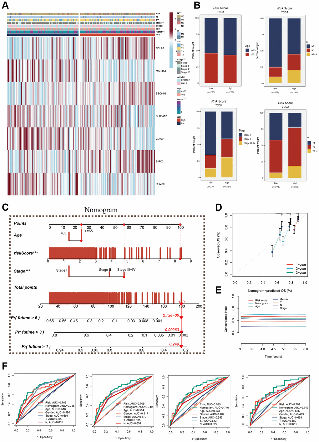 A heatmap was generated by combining clinical information and the high- and low-risk groups to visualize the distribution of clinical characteristics among different risk groups. Statistical analysis in Figure 7A revealed significant differences between the two groups concerning T and N stages, clinical stage, and fustat (P < 0.05). Notably, the high-risk group displayed a higher proportion of older patients and more advanced N and T stages (Figure 7B). Furthermore, a nomogram was constructed using clinical characteristics and risk scores (Figure 7C) to enhance the accuracy of prognosis prediction in LUAD patients. The nomogram plots can assist clinicians in assessing patient risk more accurately and guiding future treatment decisions. The calibration curve and decision curve analyses demonstrated the superior efficacy of this nomogram compared to other clinical indicators in predicting patient prognosis, thus serving as a valuable clinical decision-making tool (Figure 7D, 7E). Additionally, a comprehensive prognosis ROC analysis (Figure 7F) was conducted to evaluate the accuracy of the nomogram. The results exhibited area under the curve (AUC) values of 0.705, 0.709, 0.696, and 0.701 at 1, 3, 5, and 7 years, respectively.