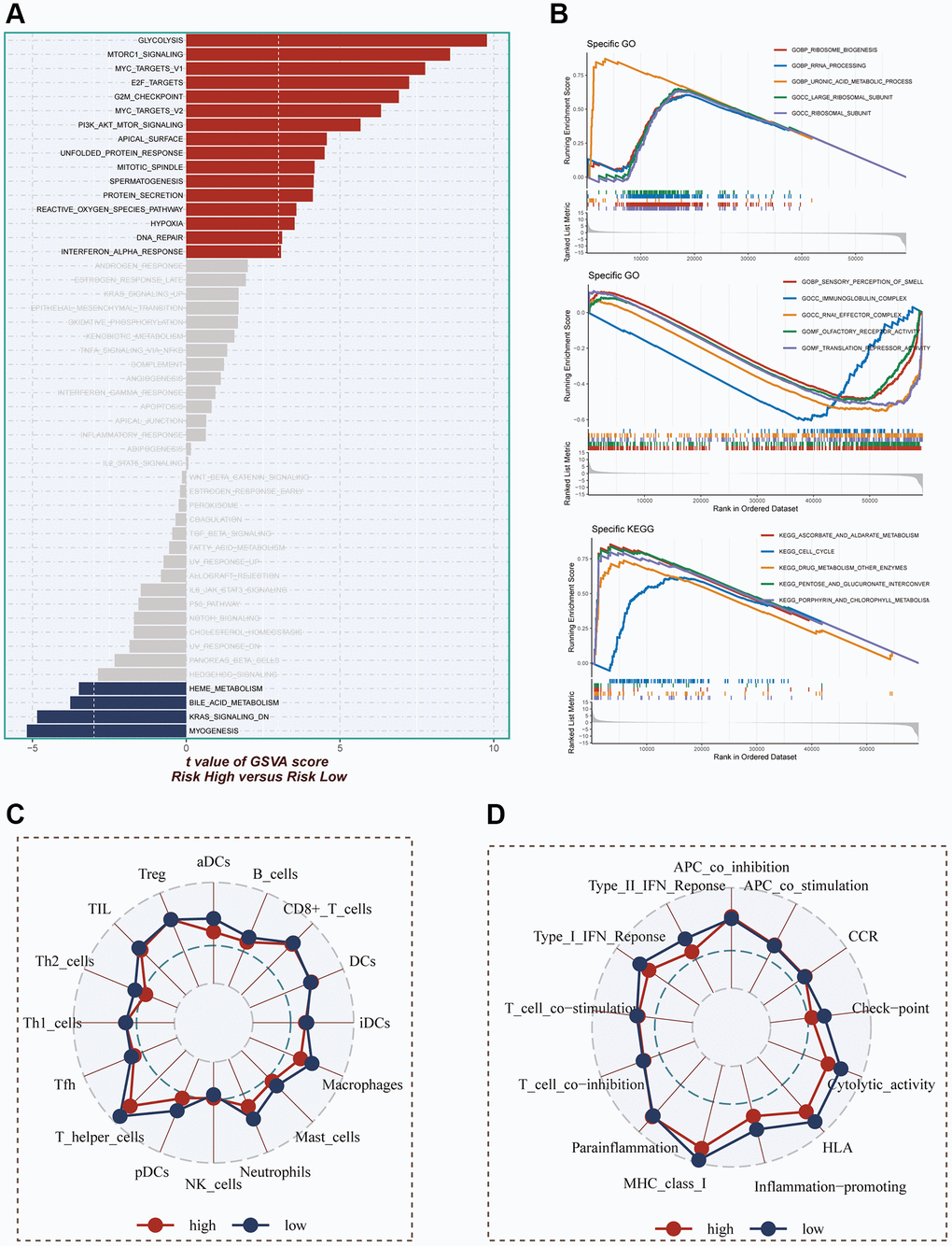 The evaluation of pathways exhibiting significant differences between the high- and low-risk groups was carried out using the hallmark gene set. In Figure 8A, it was demonstrated that enrichment in cell cycle-related pathways, including mTORC1 signaling, MYC targets V1, E2F targets, G2M checkpoint, and MYC targets V2, among others, was predominantly observed in the high-risk group. For GO and KEGG enrichment analysis, GSEA was employed. The GO enrichment results, as depicted in Figure 8B, indicated that the high-risk group exhibited significant enrichment in pathways such as ribosome biogenesis, rRNA processing, uronic acid metabolic process, and more. Conversely, the low-risk group primarily showed enrichment in pathways related to immunoglobulin complex and translation repressor activity. In terms of KEGG enrichment, the main pathways enriched in the high-risk group were cell cycle and pentose and glucuronate interconversion. To assess the differences in immune cell infiltration and immune-related pathways between the high- and low-risk groups, the ssGSEA method was utilized. The analysis revealed that the low-risk group exhibited higher levels of immune cell infiltration, including T helper cells, pDCs, macrophages, and others. Moreover, greater activity in certain immune-related pathways, such as Type II IFN response, checkpoint, HLA, among others, was demonstrated by the low-risk group (Figure 8C, 8D).
