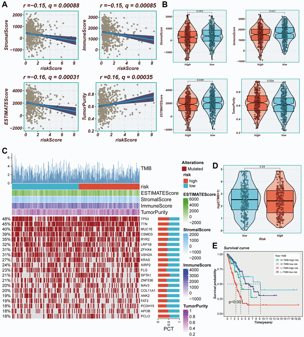 The degree of immune infiltration was evaluated using seven algorithms within the TIMER 2.0 database, and the comparison revealed greater immune cell infiltration within the low-risk group (Supplementary Figure 3). Immune infiltration levels were assessed using the “ESTIMATE” R package, wherein correlation analysis unveiled a noteworthy negative correlation between the risk score and immune score, alongside a positive correlation with tumor purity (Figure 9A). Figure 9B exhibited higher immune scores and ESTIMATE scores within the low-risk group (P < 0.05), indicating a heightened overall state of immunity and immunogenicity within low-risk group. Representative gene variants were compared between the high-risk and low-risk groups (Figure 9C). The top five genes in terms of mutation frequencies were TP53, TTN, MUC16, CSMD3, and RYR2. The low-risk group exhibited a higher TMB relative to the high-risk group (Figure 9D), albeit lacking statistical significance. Patients were stratified based on risk scores and TMB, revealing that the low-TMB and high-risk groups exhibited the most unfavorable prognosis (Figure 9E).