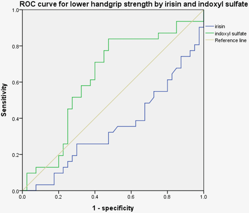The number of patients with low handgrip strength is detailed in Table 1. The mean handgrip strength was 30.38 ± 9.53 kg in the control group and 21.87 ± 10.04 kg in the ESRD group. The proportion of patients with low handgrip strength was higher in the ESRD group than in the control group (64.3% vs. 24%, respectively, p < 0.05). Clinical parameters are shown in Table 2. The concentrations of IS were 222.81 ± 90.67 and 23.19 ± 33.28 μM in the ESRD and control groups, respectively (p < 0.05). The concentrations of irisin were higher in the control group than in the ESRD group (99.77 ± 93.29 pg/mL vs. 64.62 ± 32.64 pg/mL, respectively, p < 0.05). Figure 1 shows the ROC curves of IS and irisin for predicting low handgrip strength. The ROC curves for irisin and IS were 0.298 (95% confidence interval (CI): 0.139–0.457) and 0.733 (95% CI: 0.575–0.890), respectively.