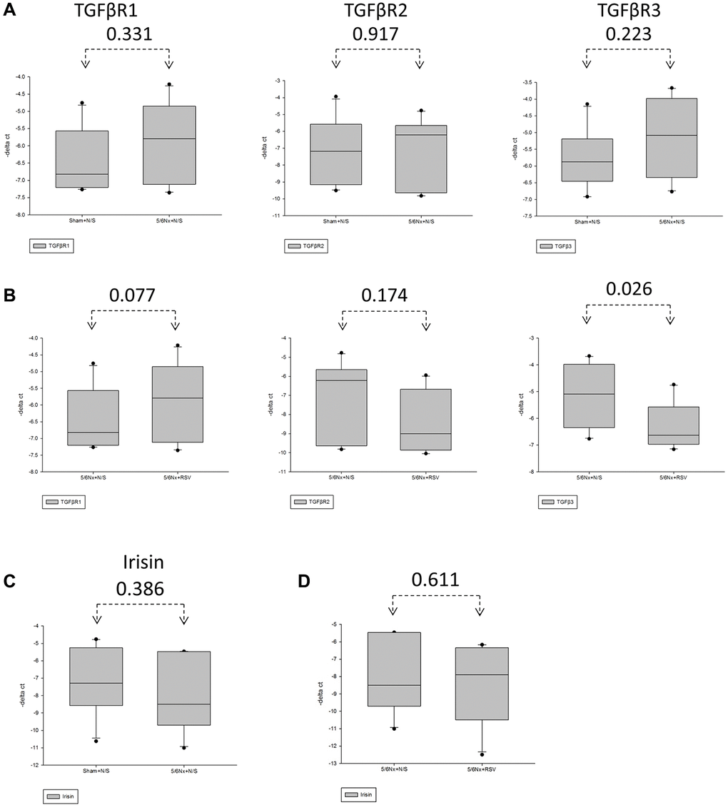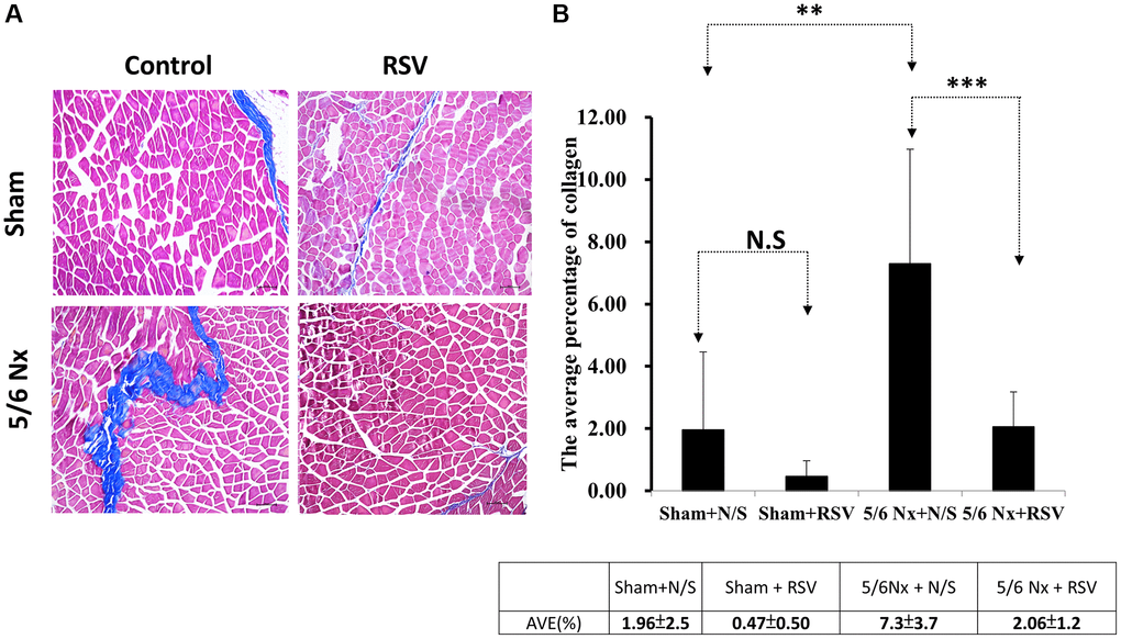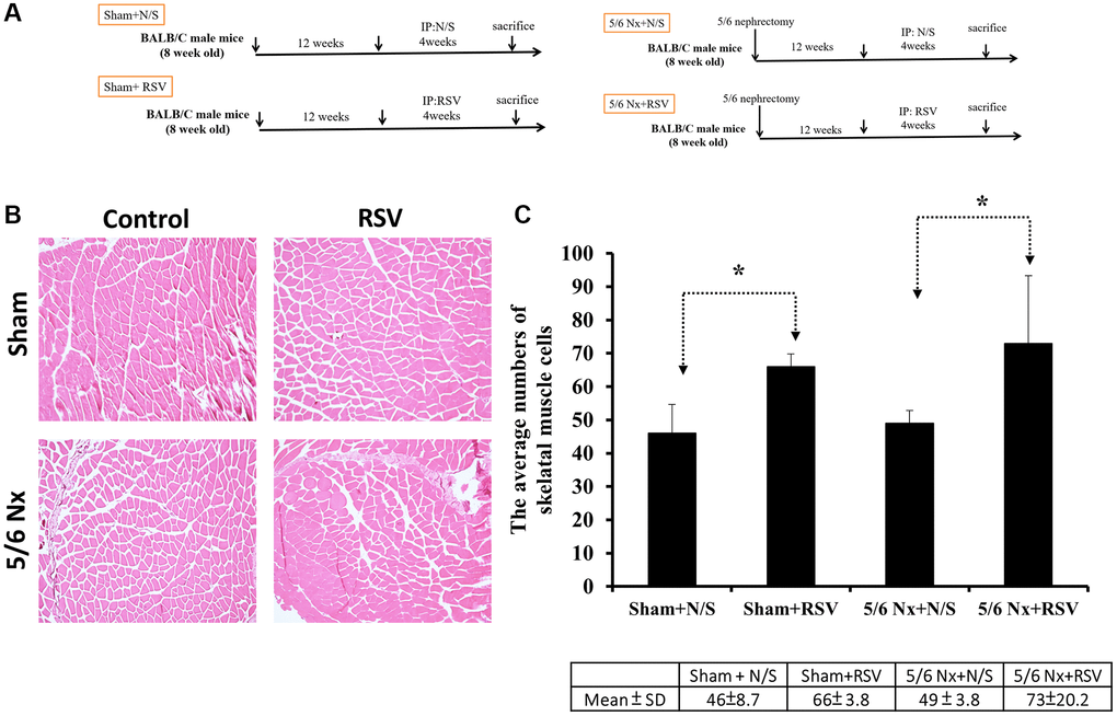 The mice were divided into four groups: sham + normal saline (NS, n = 10), sham + RSV (n = 10), 5/6 nephrectomy + NS (n = 10), and 5/6 nephrectomy + RSV (n = 10) [16]. Each group had six mice and totally 40 mice. All mice were kept in pathogen-free animal facilities under controlled conditions at 22°C with a 12-h light/dark cycle. The mice were sacrificed after 12 weeks and their gastrocnemii were analyzed.