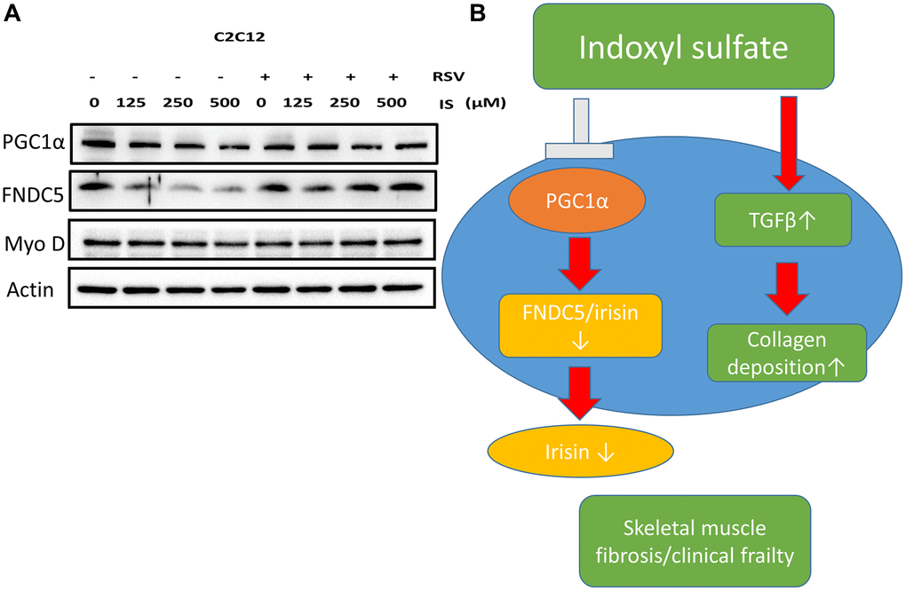 In conclusion, IS is associated with sarcopenia in patients with ESRD. IS may downregulate the expression of the PGC-1α–FNDC5 axis in patients with CKD. Furthermore, treatment with RSV ameliorates CKD-induced damage by repairing the PGC-1α, irisin, and TGF-β collagen axis.