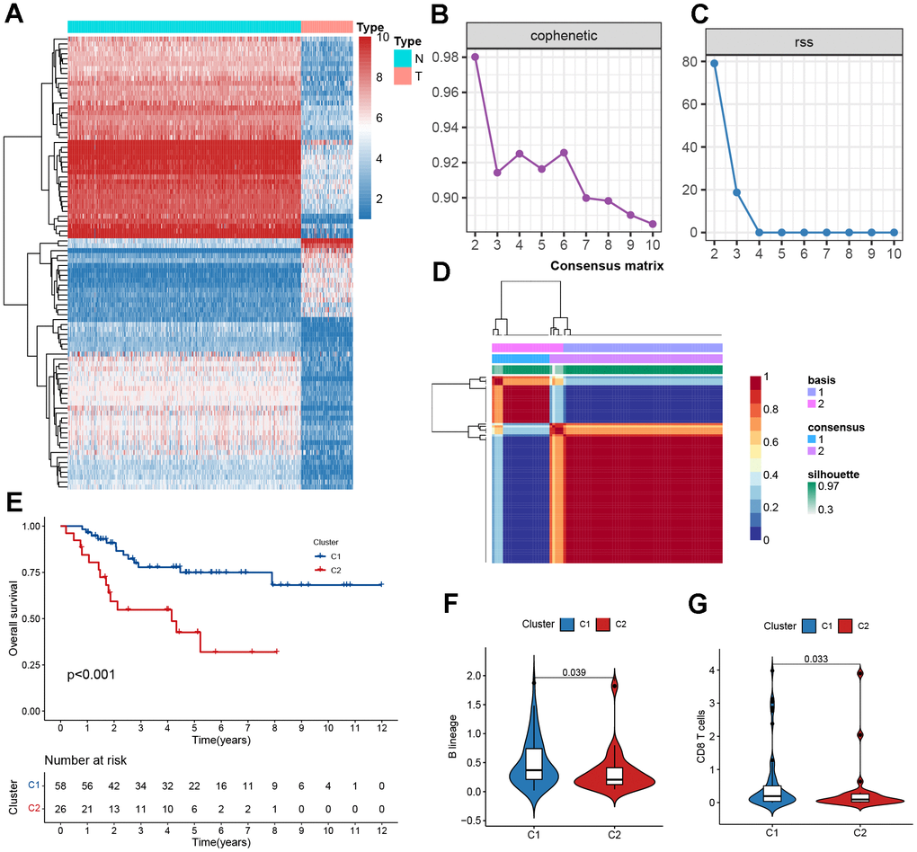 The subtypes based on MRGs in the osteosarcoma were determined using the non-negative matrix factorization (NMF) algorithm, through the “NMF” R package. The NMF algorithm is an effective method in bioinformatics to reduce the dimensionality of data such as gene expression microarrays. Clustering k-values ranging from 2 to 10 were tested, with the optimal k-value determined to be 2 based on the affinity coefficient. The levels of immune infiltration between clusters were compared using the MCPcounter algorithm.