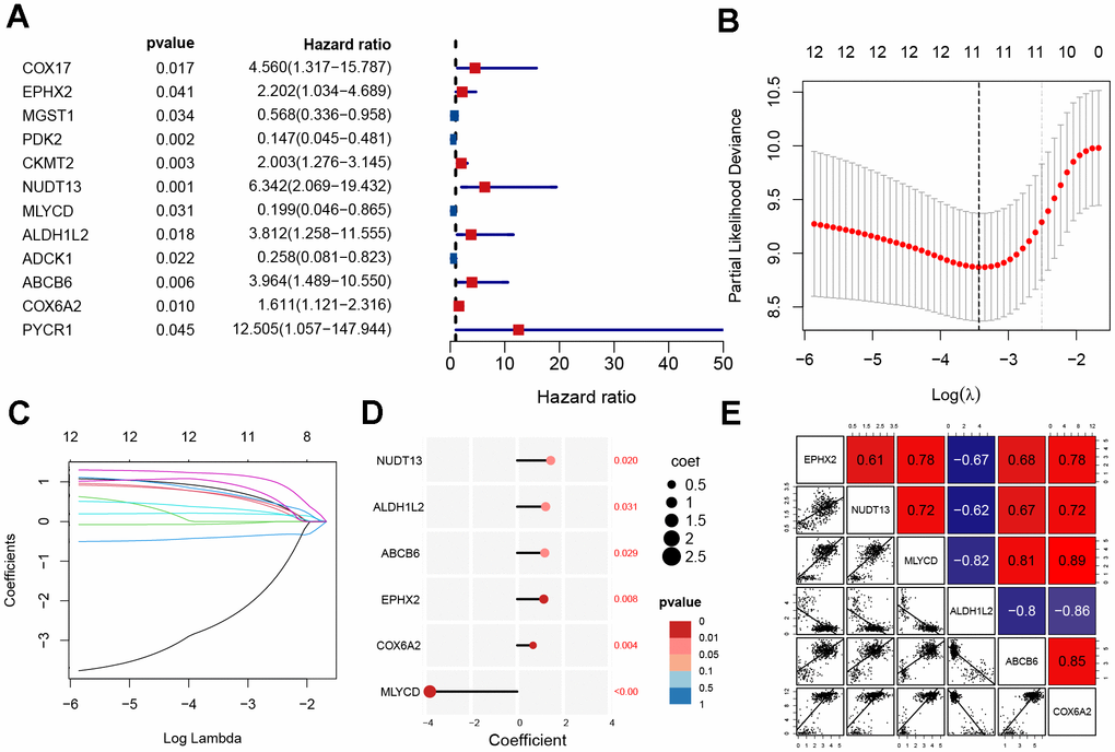 For the purpose of determining prognostic risk models, 92 MRGs were analyzed. First, 12 prognosis-related MRGs were identified using univariate regression analysis (Figure 3A). Next, LASSO regression analysis was performed on the 12 MRGs to obtain 11 genes (Figure 3B, 3C). Finally, the modeling parameters and six model genes (EPHX2, NUDT13, MLYCD, ALDH1L2, ABCB6, COX6A2) were obtained using multivariate regression analysis. Upon visualizing the parameters of the model genes and their coefficients, it was observed that only MLYCD exhibited a negative correlation with the risk feature, whereas the other five genes exhibited a positive correlation with the risk feature (Figure 3D). We also performed correlation analysis and visualized the model genes (Figure 3E).