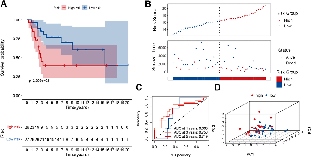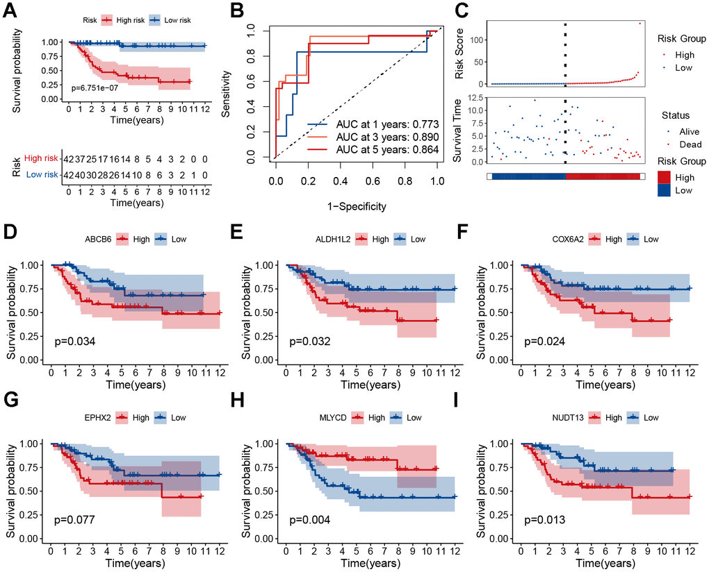 Osteosarcoma samples were divided into high-risk score and low-risk score groups according to the score medians, and survival curves were plotted using the Kaplan–Meier (KM) curve. The low-risk group had a significantly better prognosis than the high-risk group (Figure 4A, P<0.001). ROC analysis showed that the area under the curve (AUC) of the model was >0.77 at 1, 3, and 5 years (Figure 4B). Additionally, the distribution of risk scores and survival status revealed a higher risk score was associated with a higher probability of death. (Figure 4C). We performed principal component analysis (PCA) to demonstrate the predictive power of our model, which indicated significant differences in patient distribution (Supplementary Figure 6). We also performed survival analysis for each model gene and found that NUDT13, MLYCD, ALDH1L2, ABCB6, and COX6A2 were associated with patient prognosis (Figure 4D–4I). In addition, MLYCD was shown to be the sole protective factor (P=0.004).