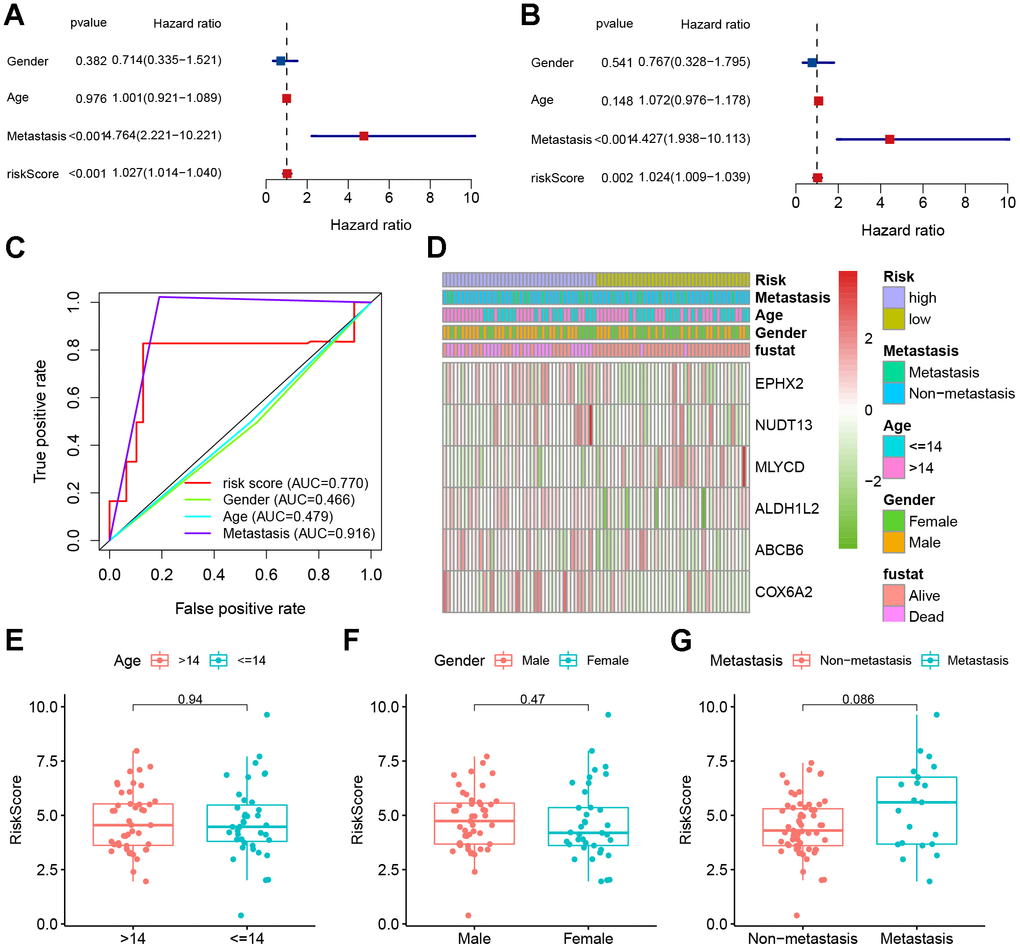 Univariate Cox analyses were performed for the TARGET cohort after integrating the risk scores and clinical information. The risk score was a significant predictor of osteosarcoma, as shown in Figure 6A. Multivariate Cox analysis indicated that poor prognosis was significantly associated with risk score (Figure 6B). The AUC of the risk score was 0.770 (Figure 6C). This indicates that our risk model was capable of effectively predicting patient prognosis. After that, we plotted a heatmap of model genes versus clinical traits to roughly demonstrate the relationship between genes and clinical traits (Figure 6D). The MLYCD expression levels were negatively correlated with risk scores, suggesting that MLYCD may act as a protective factor; however, ABCB6 was positively correlated with the risk score. Box plots showing the relationship between clinical and risk scores (including metastasis, sex, and age) revealed that age and sex did not differ between subgroups (Figure 6E–6J).