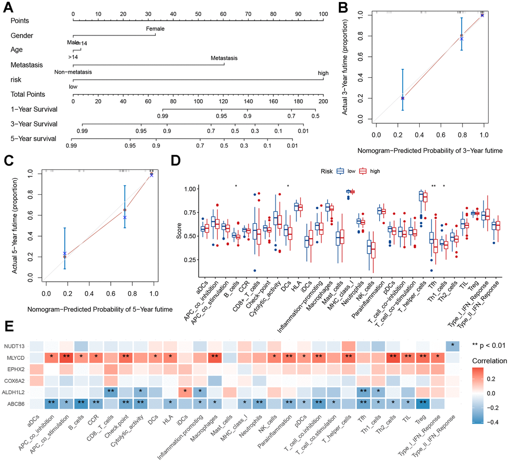 To predict the risk of osteosarcoma in patients and understand the relationships between variables, a nomogram was constructed. The results showed that our constructed risk model contributed the most to predicting the outcome (Figure 7A). In addition, prediction accuracy of the columnar graph was evaluated using the C-index. The column line graph showed an ideal predictive ability for the 1-, 3-, and 5-years’ survival probability of patients (Figure 7B, 7C and Supplementary Figure 8). Using the TARGET dataset, an ssGSEA was conducted to evaluate immune cell infiltration levels. Immune cell infiltration and related functions in the high-risk group showed a downward trend (Figure 7D). To investigate the relationship between six genes (EPHX2, NUDT13, MLYCD, ALDH1L2, ABCB6, COX6A2) and immune infiltration, correlation plots were generated. Positive correlations were found between immune infiltration and MLYCD expression (Figure 7E). There was evidence to show that low-risk patients may experience higher levels of immune cell infiltration.