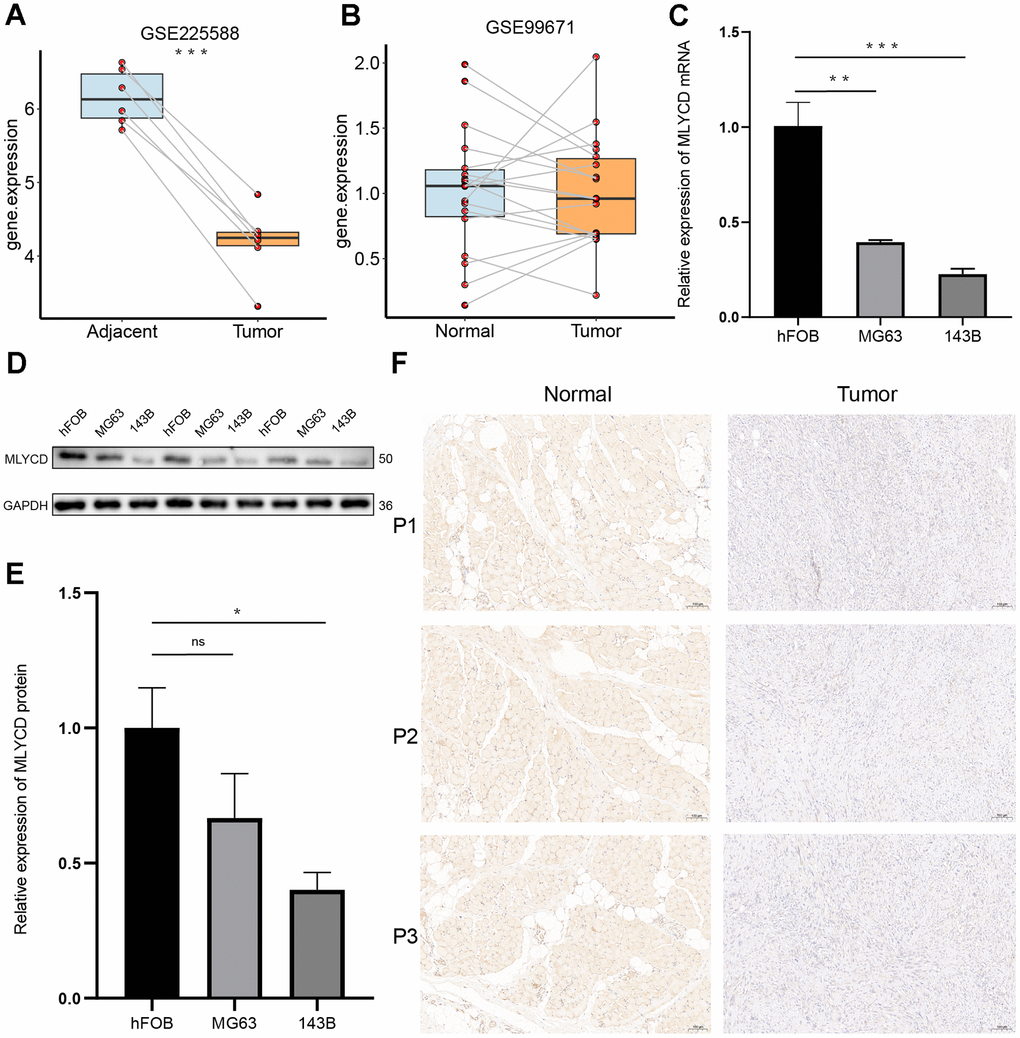 Only MLYCD was identified as a protective gene (Figure 3D), so further experiments on this gene were performed. First, its expression was verified using the GEO dataset, and both GSE225588 and GSE99671 showed that MLYCD was lowly expressed in osteosarcoma tissues (Figure 8A, 8B). Next, the expression level of MLYCD gene in osteosarcoma cell lines (MG63 and 143B) and osteoblasts (hFOB 1.19) were verified by PCR (Figure 8C) and western blotting (Figure 8D, 8E). The expression level of MLYCD in osteosarcoma cells was lower than osteoblasts. Finally, by IHC staining of three pairs of osteosarcoma tissues and adjacent tissues, MLYCD was found to be lowly expressed in in osteosarcoma tissues (Figure 8F). All of the above results suggested that MLYCD was lowly expressed in osteosarcoma tissues.