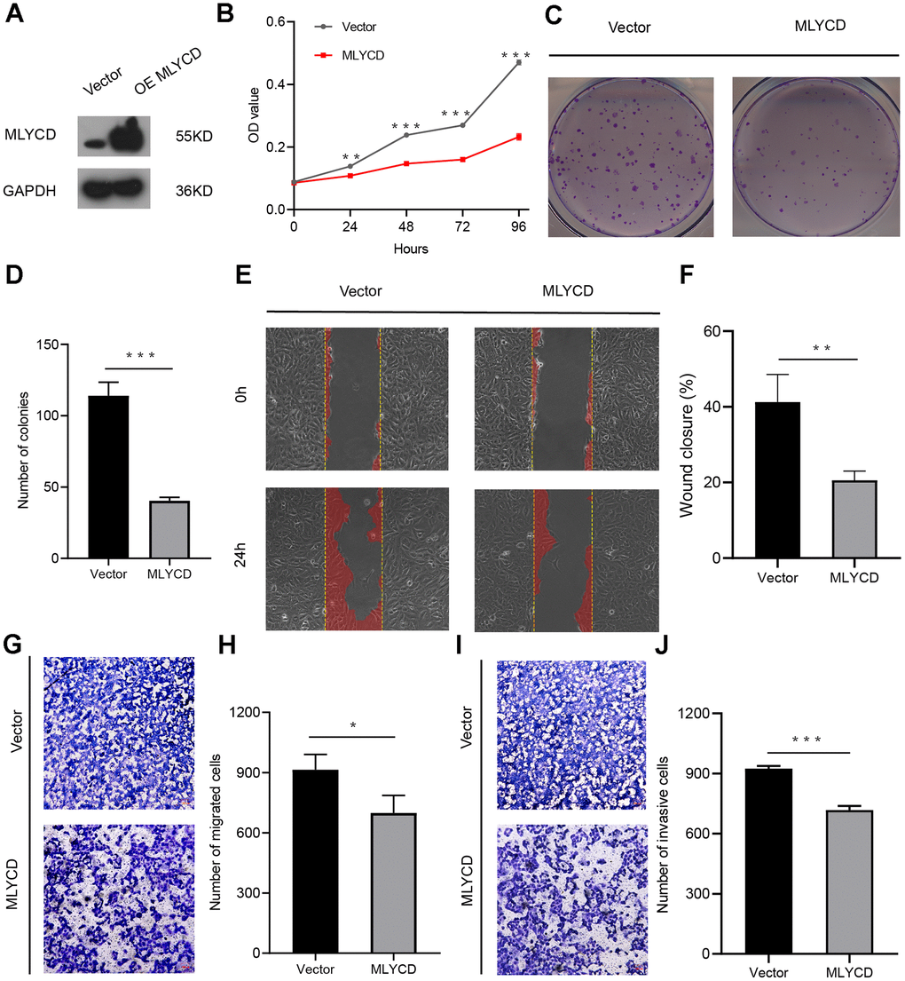 To further investigate the role of MLYCD in osteosarcoma, overexpression of MLYCD in the MG63 cell line. Western blot confirmed the up-regulated expression of MLYCD in MG63 cells by lentiviral transduction (Figure 9A). CCK8 and plate colony formation assay showed that MLYCD overexpression led to decreased MG63 cell proliferation (Figure 9B–9D). In wound healing assays, MLYCD overexpression significantly suppressed MG63 cell migration (Figure 9E, 9F). In addition, transwell assays showed that MLYCD overexpression significantly reduced MG63 cell migration and invasion (Figure 9G–9J). In this study, the upregulation of MLYCD inhibits MG63 cell proliferation, migration, and invasion.