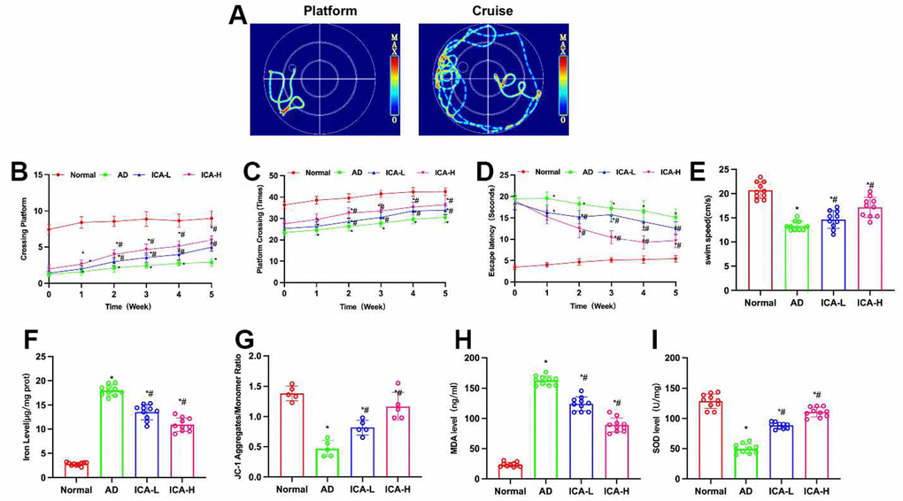 According to the water maze results, ICA could improve the cognitive and behavioral abilities of AD mice. Compared to the Normal group, AD group exhibited obvious cognitive impairment, prolonged escape latency, reduced number of platform crossings and shortened swimming distance. ICA could improve such situation, which shortened the escape latency, increased the number of platform crossings and prolonged the swimming distance, showing significant differences from the AD group (Figure 1A–1E).