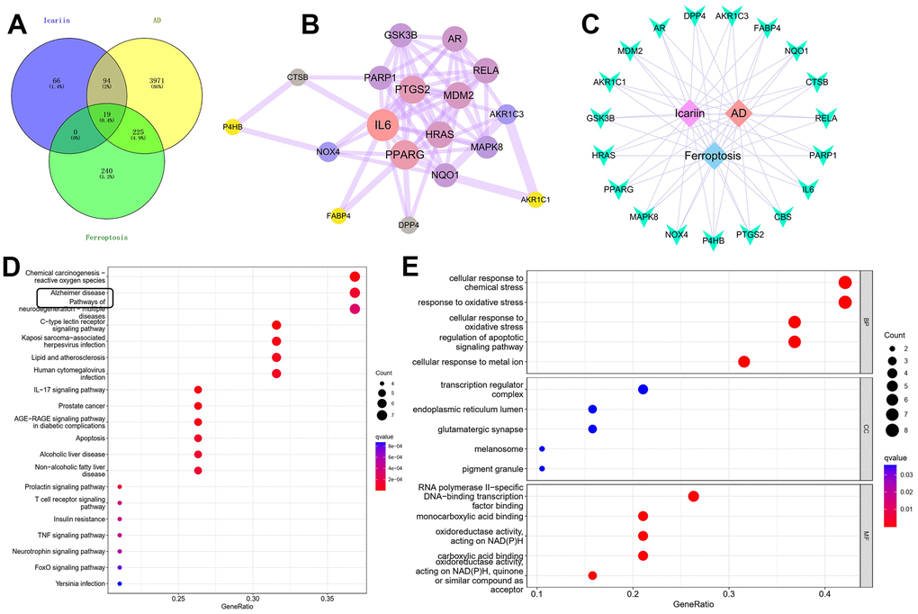 There were 179 drug targets, 4,309 AD-related genes and 484 ferroptosis genes. The genes intersecting among the three totalled 19, accounting for 0.4% of the overall genes. Eighteen related genes were obtained from the PPI network of medicinal materials for disease treatment, and 64 targets were interrelated. We found that MDM2 was the primary target of ICA, which was closely associated with ferroptosis as well (Figure 2A, 2B). A “medicinal material–component–target” visual network diagram was created via Cytoscape (Figure 2C) as well as 107 signaling pathways like C-type lectin receptor, chemical carcinogenesis–reactive oxygen species and IL-17 pathways (Figure 2D, 2E).