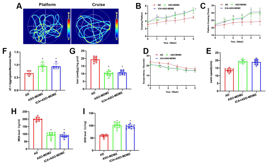 To verify the correlation between ICA and MDM2, ASO-MDM2 was used in conjunction with ICA in animal experiments to inhibit the expression of MDM2 and to antagonize its effect. Morris water maze results demonstrated that ASO-MDM2 and ICA+ASO-MDM2 could improve the cognitive ability of AD mice, shorten their escape latency, increase their platform crossings and prolong their swimming distance, showing significant differences from the AD group, albeit insignificant differences between these two groups (Figure 3A–3E).