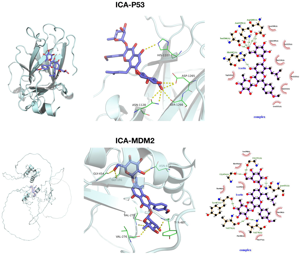 We docked ICA with P53 and MDM2 through small molecule–protein docking, finding that ICA and P53 were mainly assembled by hydrophobic bonds at HIS, ASP, ASN and SER sites, which were bound primarily with O and insufficiently tightly with hydrophobic pockets. Meanwhile, ICA and MDM2 were assembled by hydrogen and hydrophobic bonds at sites like GLY, VAL, TYR and ASN, which were bound tightly with hydrophobic pockets. From a docking structure perspective, ICA and MDM2 were more tightly bound, with lower binding energy (Figure 4).