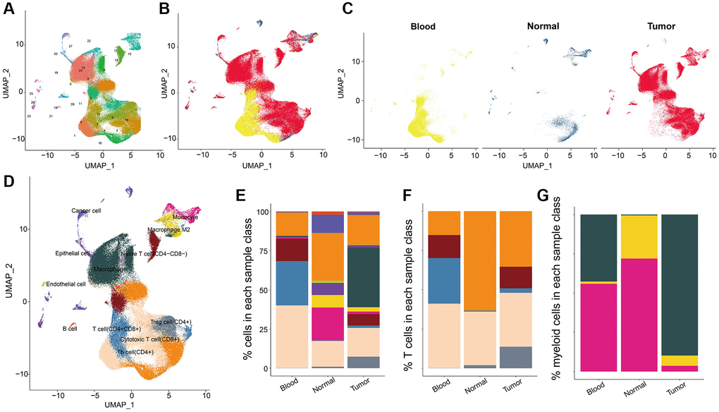 We identified a total of 23886 genes in 153,595 cells by integrating the GSE117570 and GSE162498 data with Seurat algorism. According to tSNE/UMAP analysis, these cells were mainly enriched into 29 distinct clusters (Figure 1A). Also, the cell distribution pattern in three sample types (tumor tissues, corresponding para-tumor normal tissues, and blood samples) was visualized. Most cells were mainly augmented in tumor tissue samples while the corresponding para-tumor normal tissue samples gained the lowest cell abundance (Figure 1B, 1C). The overall cell could be annotated into 12 cell types (Figure 1D). The cellular compositions, including cancer cells, T cells, B cells, endothelial cells, and so on (a total of 12 types of cells) in each sample type differed from other types. We found that blood samples had the highest abundance of T cells with the highest percentage of CD4+ T cells. Tumor tissue carried most cellular components such as cancer cells, T cells, B cells, and endothelial cells, among which macrophage had the highest percentages, following CD4+ and CD8+ T cells (Figure 1E). Furthermore, we found that CD4+ and CD8+ T cells were evenly distributed in tumor samples compared with the normal group (Figure 1F). Consistently, the macrophage was the most abundant of three myeloid cells (macrophage, monocyte, and M2-macrophage) in tumor tissues compared to the normal tissue (Figure 1G). These results suggested the active anti-cancer response in tumor tissues.