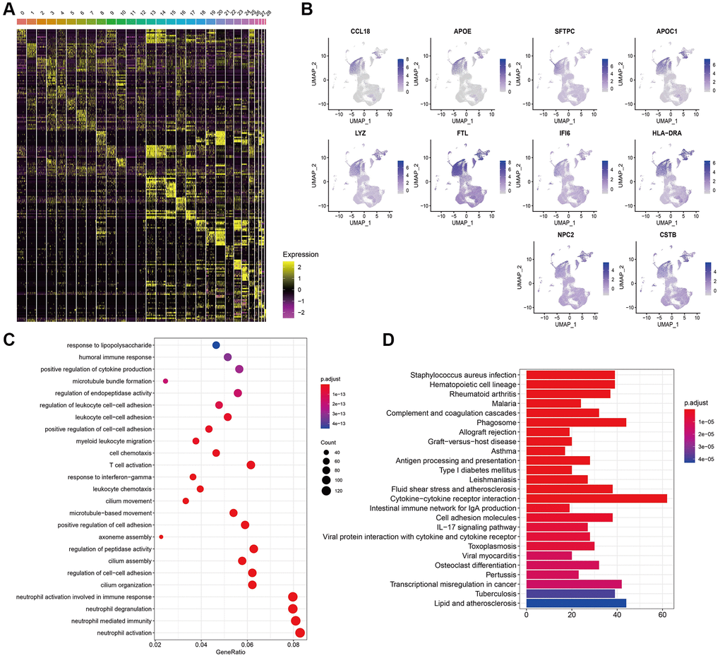 The heat map of the top 10 DEGs in each cluster was shown in Figure 2A. Interestingly, the top 10 DEGs identified by cluster 0 were distributed at cluster 0 other than resident clusters (Figure 2B), validating the efficacy of our cell cluster analysis. Observing the abundance composition of cluster 0, we obtained DEGs in cluster 0. GO and KEGG analysis of DEGs in cluster 0 was displayed in Figure 2C, 2D. They were associated with T cell activation and autoimmune disease pathways.
