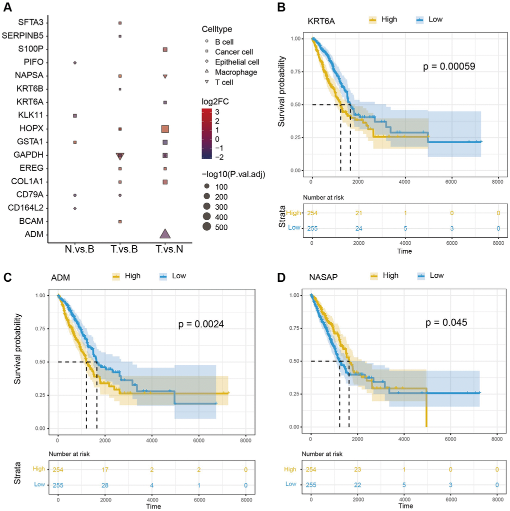 We obtained the DEGs between three samples of each cell type. The top 10 DEGs in were shown in Figure 3A. The overlapping genes between DEGs and cell-specific gene lists were used as marker genes for matching cells. 285 marker genes were identified in the cancer cell, which was consistent with the tumor tissue feature. 142 marker genes were identified in T cells and 225 marker genes in macrophages. Here, we acquired cancer cells, T cells, and macrophage marker genes. Furthermore, we investigated the influence of these cell marker genes on NSCLC survival based on TCGA-LC clinical data. Results indicated that 17 marker genes were found to have significant effects on tumor survival (3 representative genes, KRT6A, NASPA, and ADM Figure 3B–3D).