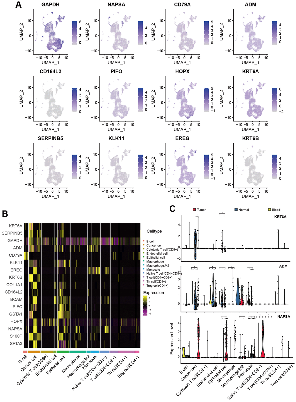 Considering these PAMGs in tumor prognosis and development, we also explored their expression pattern in our training set (GSE117570 and GSE162498). Gene expression patterns of 17 PAMGs in three sample types were shown in Figure 4A. The heatmap of 17 PAMGs in different types of cells was displayed in Figure 4B. Furthermore, the box plots of gene expression of 3 representative genes, KRT6A, NASPA, and ADM were also displayed in Figure 4C. KRT6A was mainly expressed in the cancer cell. We could conclude that most PAMGs were up-regulated in cancer cells and epithelial cells. These results demonstrated that cancer cells play a crucial role in cancer progression while other cells such as T cells were not directly engaged in tumor development.