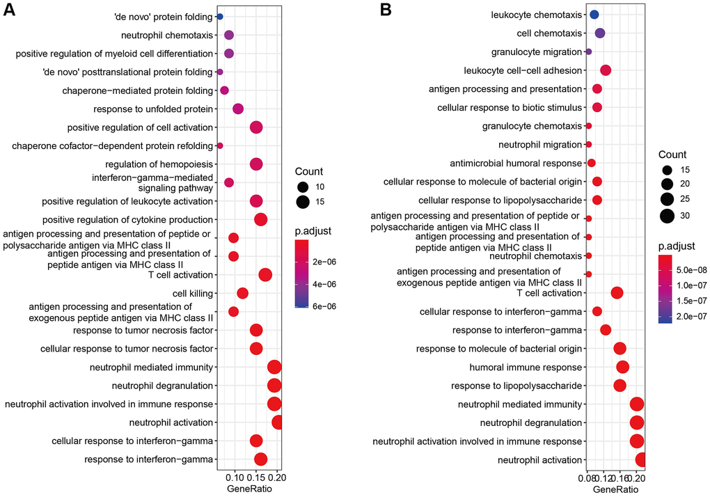 The GO and KEGG enrichment analysis of cell marker genes in different cell types were performed to examine the functional difference. The most significant pathway in T cells was “response to interferon-gamma”, which was found to be related to antigen recognition (Figure 5A). Recent studies have revealed that lung cancer–specific tumor-infiltrating CD8+ T cells had a distinctive differentiation trajectory, which acquired effector and exhausted phenotypes. This unconventional T cell dysfunction explained the ICB resistance for some NSCLC patients [22]. Of course, IFN-γ has a pivotal influence on ICB efficacy, evidenced by that IFN-γ-related mRNA profile exerted a predictive influence on PD-1 blockade response in a clinical trial setting [23]. On the contrary, the most significant pathway enriched in macrophage was neutrophil activation (Figure 5B), which is related to innate immune activation. Increasing data has demonstrated that there were two lineages of macrophages: local tissue-resident macrophages and those derived from monocytes in NSCLC [24]. Early-stage tumors were influenced by tissue-resident macrophages which enhance tumor cell invasiveness and create a protective shield by triggering a powerful regulatory T cell response [24]. Interestingly, as the tumor expands, monocyte-derived macrophages rise in number, pushing tissue-resident macrophages to periphery of the TME [24]. These data highlighted the potential in focusing on tissue-resident macrophages for early NSCLC interventions. These results indicated that the gene expression pattern of maker genes was strictly governed by the cell functional phenotypes.
