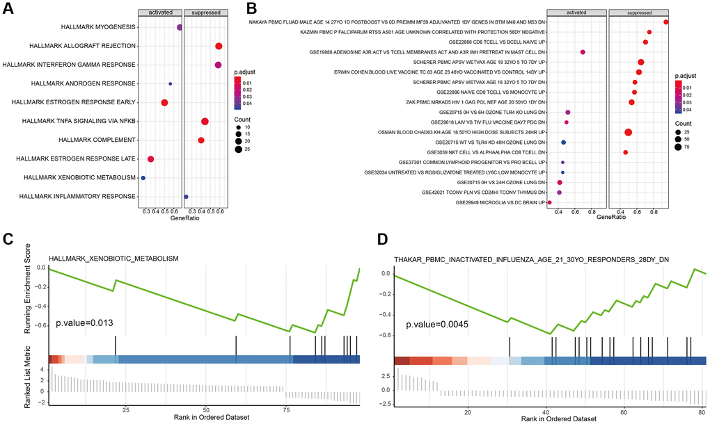 We downloaded the hallmark and immunologic signature and gene set from the MSigDB database to scrutinize the function of our marker genes in tumor-associated and immune-related pathways. By KEGG analysis in tumor signal pathways, we found that B cell maker genes were mainly enriched in estrogen response, interferon-gamma response, androgen response, TNF-α signaling via NK-κB, and complement response (Figure 6A). The immune signature pathway of B cell maker genes was shown in Figure 6B. GSEA results illustrated that the cancer cell marker gene was significantly enriched in xenobiotic metabolism (Figure 6C), suggesting the hyperactive metabolism response of cancer cells. Also, GSEA of immune signature enrichment showed that the macrophage marker gene was mainly engaged in influenza induced by PBMC inactivation (Figure 6D), suggesting macrophages play a key role in innate immunity. This was consistent with our previous results (Figure 4B).
