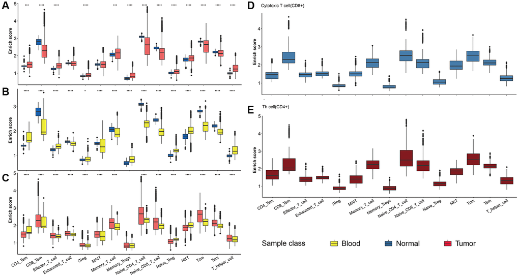Considering the great impact of T cells on tumor progression, we focused on the T cells subpopulation with distinct phenotypes. Here we collected the maker of 17 T cell subpopulations with different phenotype functions (https://www.cellsignal.com/pathways/immune-cell-markers-human). The abundance of various T cell subpopulations in three NSCLC samples was shown in Figure 7A. Most T cells were up-regulated in tumor samples (including tissue and blood) compared with the normal group. Furthermore, we found that the distribution pattern of the 17 T cell subpopulation in CD8+ T cells was similar to CD4+ T cell, with the CD8+ T cell and naïve T cell highest infiltration (Figure 7B–7E).