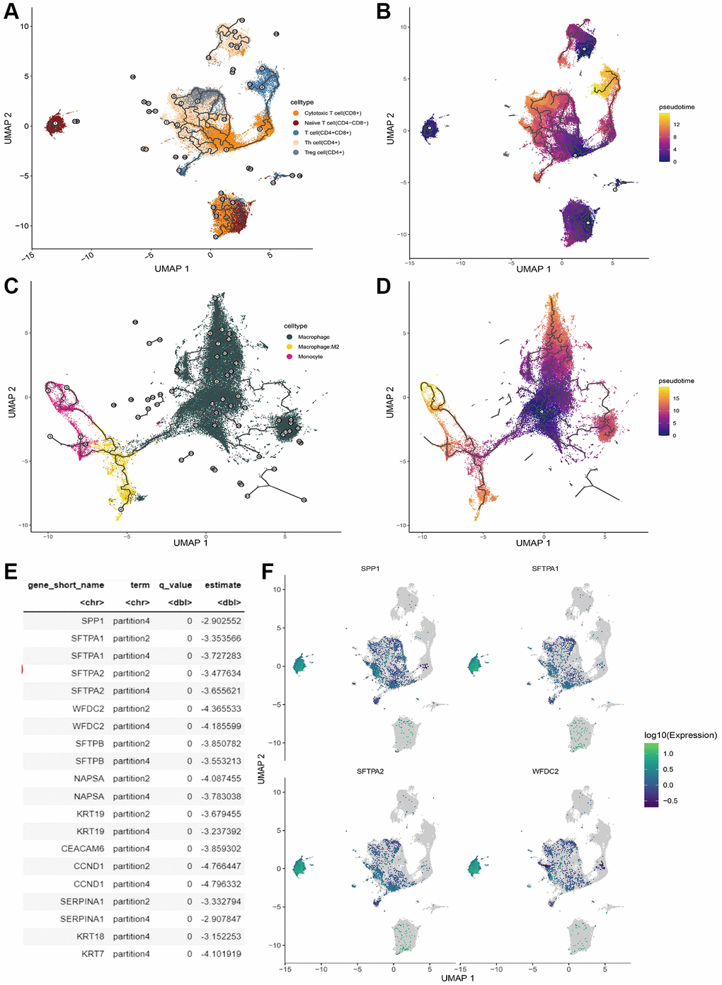 Trajectory analysis can reshape the dynamic evaluation process of cell development and maturity by focusing on the different stage cells with distinct gene signatures. Here we dissected the trajectory development process of T cells and myeloid cells, respectively by performing correlation analysis between marker genes and developmental trajectories of T cell and myeloid cell via Monocle3. These significant genes were selected for the following trajectory analysis via Monocle3. The developmental trajectory of T cells was shown in Figure 8A, 8B. There was heterogeneity in the differentiation pathway of T cells with distinct phenotypes. Conversely, both M2-macrophage and monocyte evaluation toward macrophage (Figure 8C, 8D). In addition, we identified 57 marker genes that were found to exert vital function in the developmental trajectories of T cells (Figure 8E). We also investigated the expression pattern of their expression in T cells (Figure 8F). Most marker genes were down-regulated in naïve T cells and they were expressed in CD8+ and CD4+ T cells.