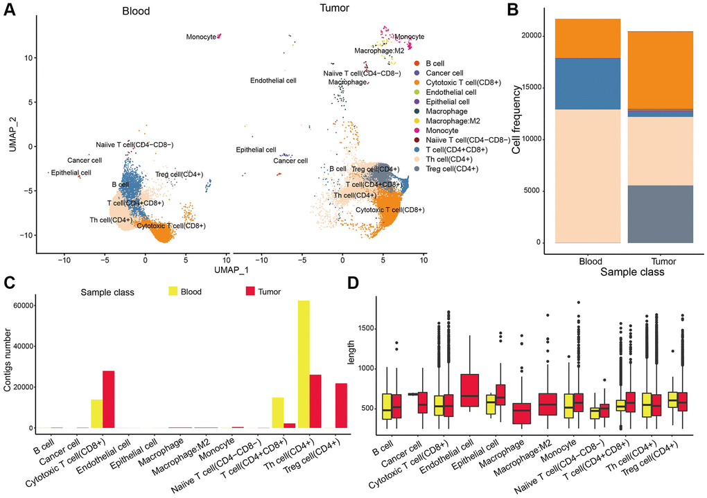 The specific gene list expressed in each cluster was collected by using the FindAllMarkers function in the Seurat package. Herein, the cell type in each cluster was annotated by the combination of the singleR (3.17) method and manual annotation (Supplementary Table 1). The marker gene annotated manually comes from this article [21] and the immune cell marker website (http://www.cellsignal.com/pathways/immune-cell-markers-human). Also, these cluster-specific genes identified by FindAllMarkers were regarded as cell type-specific genes of annotated cells in the matching cluster. In each cell type, the differentially expressed genes (DEGs) among different groups (tumor, normal, and blood samples) were acquired by using the limma and DESeq method with the threshold of p-value < 0.05. The overlapping genes between cell-specific genes and DEGs were defined as the matching cell marker genes.