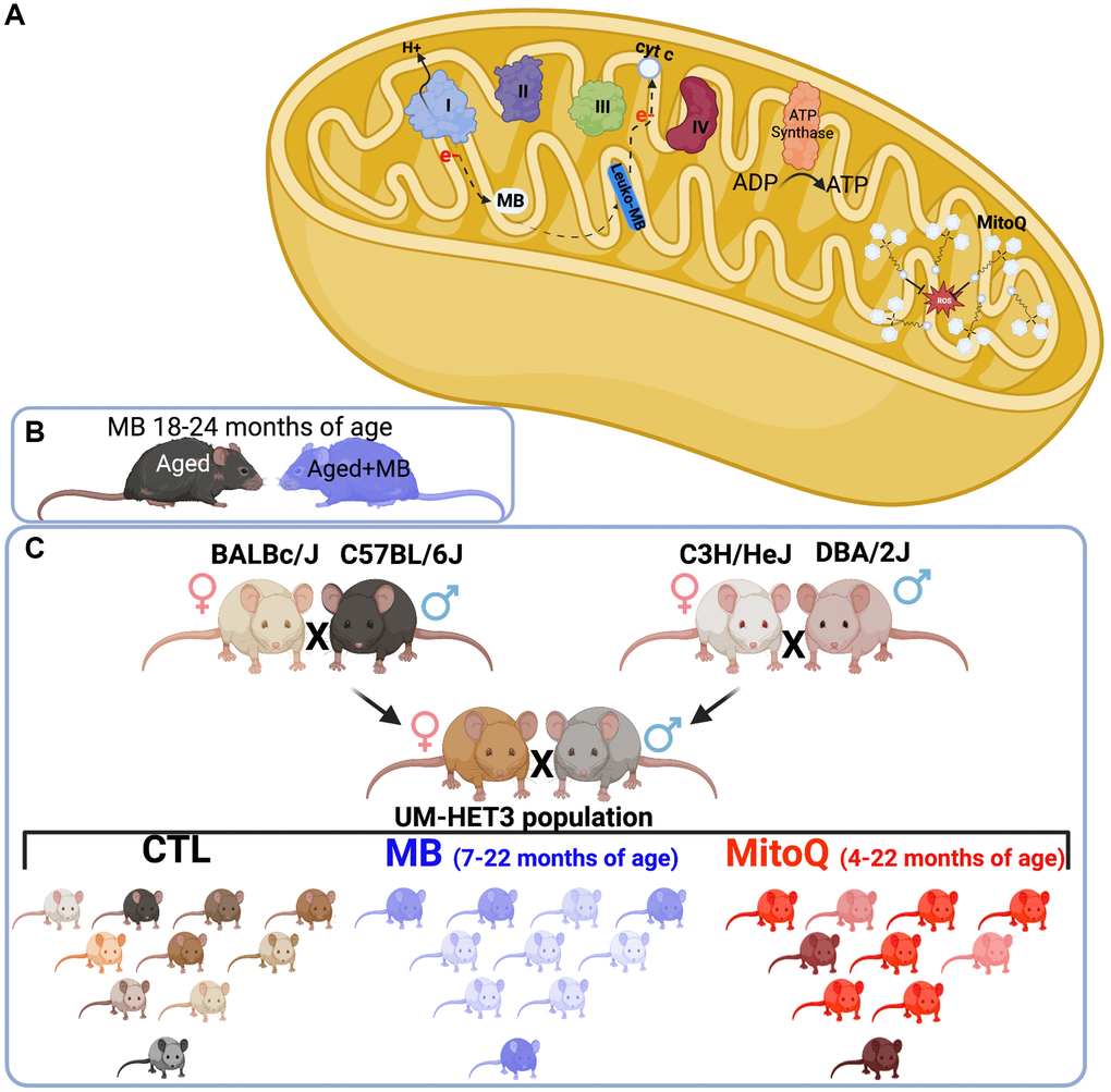MB (28 ppm, starting at 4 months of age) or MitoQ (100 ppm, starting at 7 months of age) were administered in the diet. MB and MitoQ were formulated into irradiated Purina TestDiet 5LG6 diet, and supplied to all three sites so all sites used the same batches of food.