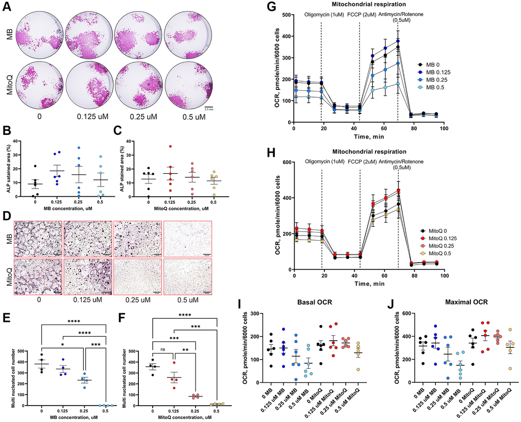 To investigate the effects of MB and MitoQ on various aspects of osteogenesis, we conducted in vitro experiments. Mesenchymal stem cells (MSCs) extracted from femur and tibia of 7-month-old UM-HET3 mice. First, we assessed the effects of increasing concentrations of MB or MitoQ on the viability of MSCs (which includes the osteoprogenitor cell pools). Our results, shown in Supplementary Figure 1, indicated that MSC viability was not significantly affected by doses of 0.125–0.5 μM of MB (Supplementary Figure 1A) or MitoQ (Supplementary Figure 1B). Next, we examined the effect of MB and MitoQ on the differentiation of MSCs to osteoblasts, the bone forming cells. MSCs were induced to differentiate into osteoblasts, in the presence of varying concentrations of MB or MitoQ for 18–28 days. We evaluated the presence of alkaline phosphatase (Alk-Phos) positive colonies as an indicator of osteogenic activity at 18 days of culture. Importantly, no significant differences in Alk-Phos staining were observed between the control group and those treated with MB or MitoQ at concentrations ranging from 0.125–0.5 μM (Figure 2A–2C). To investigate the effects of MB and MitoQ on osteoclast formation, we isolated bone marrow hematopoietic cells and stimulated them with RANKL and M-CSF in the presence of increasing concentrations of MB and MitoQ. Our findings demonstrated that MB and MitoQ inhibited in vitro osteoclast differentiation in a dose-dependent manner, as evidenced by a reduced number of multinucleated, TRAP positive cells at concentrations above 0.25 μM (Figure 2D–2F). Additionally, we examined the effect of MB and MitoQ on the respiration of mature osteoblast cells. After 14 days in culture, mature osteoblasts were exposed to different concentrations of MB or MitoQ for 48 hours and then subjected to a mitochondrial stress assay using the Seahorse bioanalyzer. Interestingly, despite their effects on mitochondrial function, MB or MitoQ did not affect basal oxygen consumption rate (OCR) (Figure 2G–2I) or maximal respiration (Figure 2J) in differentiated osteoblasts.