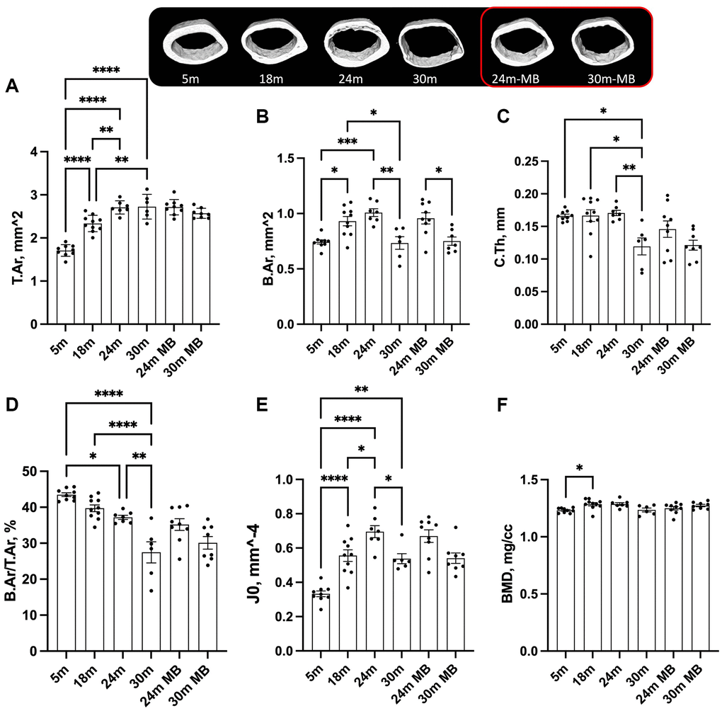 Our findings revealed age-associated bone loss at all skeletal sites (Figure 3). In the control females, the total cross-sectional area (T.Ar) increased by 35%, bone area (B.Ar) increased by 24%, and marrow area (M.Ar) increased by 40% from 5 to 18 months of age (data not shown) (Figure 3A, 3B). This resulted in a 10% decrease in the B.Ar/T.Ar ratio between 5 and 18 months of age (Figure 3D). Cortical thickness (C.Th) remained similar between 5 and 18 months of age but decreased by 10% between 18 and 24 months and by 30% between 18 and 30 months of age (Figure 3C). Polar moment of inertia (J0) increased from 5 to 24 months of age and reduced at 30 months (Figure 3E). BMD increased from 5 to 18 months of age in control mice and remained unchanged thereafter (Figure 3F). Mice treated with MB showed similar changes to their corresponding controls at the same age.