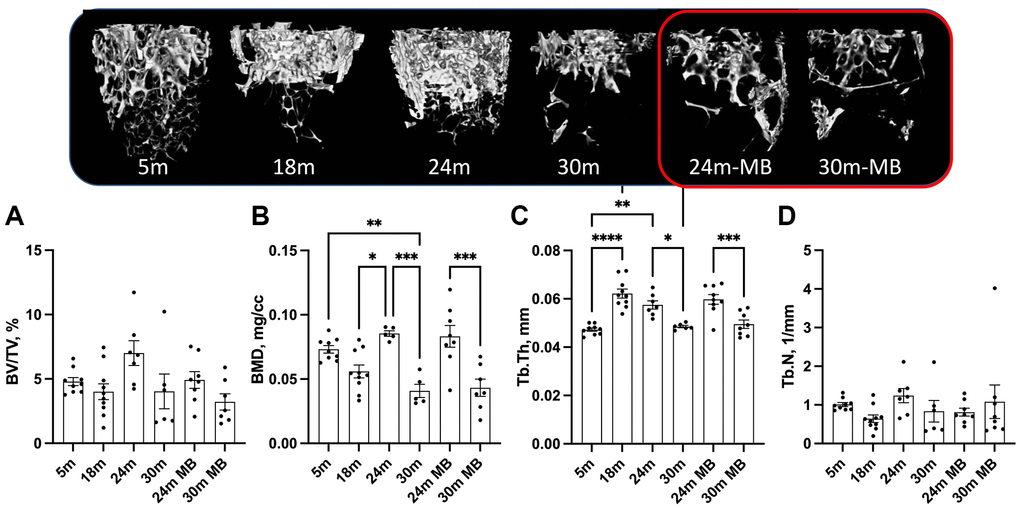At 5 months of age, control females exhibited low levels of trabecular bone volume/total volume (BV/TV) at the distal femur metaphysis, ranging between 5–6% (Figure 4A). Furthermore, we observed decrease in bone mineral density (BMD) in the trabecular bone compartment at the distal femur, along with decreased trabecular thickness (Tb.Th) with age, regardless of MB treatment (Figure 4B, 4C). However, trabecular number (Tb.N) did not show significant differences with age or treatment (Figure 4D). Similarly, the trabecular bone of the L-5 revealed a 35% reduction in BV/TV, 18% reduction in BMD, and a twofold decrease in Tb.N with age, irrespective of MB treatment (Figure 5A–5C). Tb.Th did not exhibit significant differences between the age or treatment groups (Figure 5D). Overall, MB did not protect against age-induced bone loss.