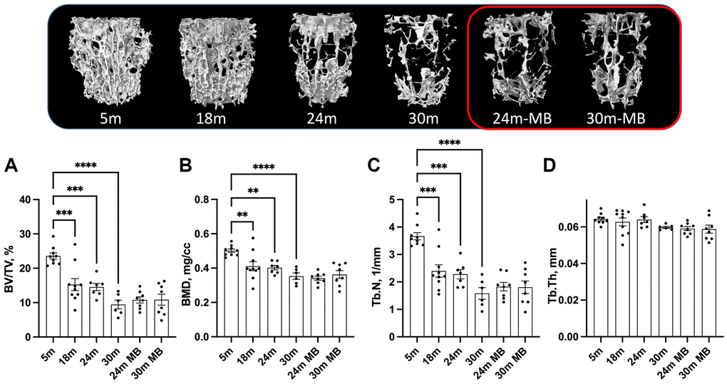 To investigate the effects of MB on bone morphology during aging, we conducted a study using 18-month-old female C57BL/6J mice. The mice were treated with 250 μM of MB, administered via drinking water for either 6 or 12 months. We dissected bones and tissues at 18, 24, or 30 months of age. Additionally, we included a group of young control females at 5 months of age to evaluate the changes from young to aged mice. The dissected bones were subjected to micro-CT to study bone morphology at three different sites: cortical bone at the femur mid-diaphysis, trabecular bone of the appendicular skeleton at the femur distal metaphysis, and trabecular bone of the axial skeleton at the lumbar vertebra-5 (L5).
