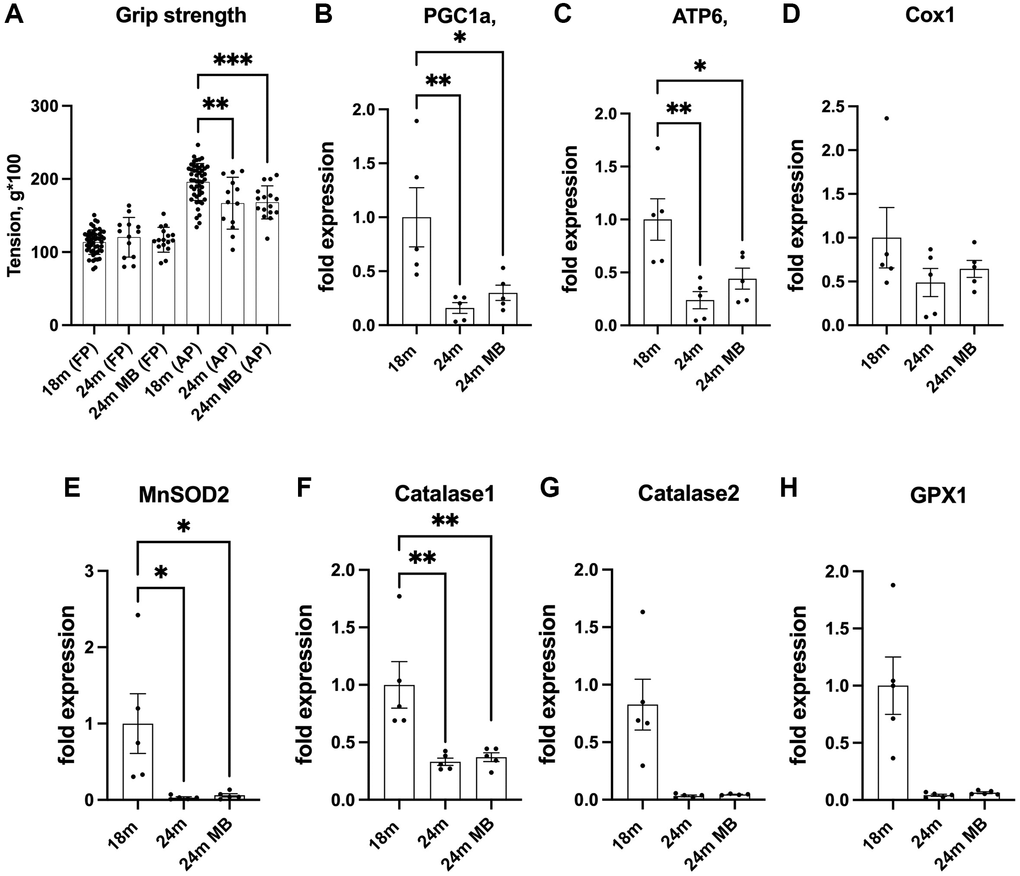 Finally, we examined the impact of MB on the expression of genes related to mitochondrial content and function in osteocytes, which are cells embedded within the bone matrix. We observed age-related decreases in the expression of antioxidant enzymes, including catalase-1 and 2, as well as glutathione peroxidase 1 (GPX1). Additionally, the expression of mitochondrial markers, such as ATP synthase 6 (ATP6), cytochrome oxidase subunit 1 (Cox1), peroxisome proliferator-activated receptor-g coactivator-1a (PGC1a), and manganese-dependent superoxide dismutase (MnSOD2), were reduced with age. MB did not have a significant effect on the age-related reductions in the expression of these genes (Figure 6B–6H). Notably however, the abundance of the above transcripts can only indicate the potential for protein synthesis and do not directly reflect protein activity.