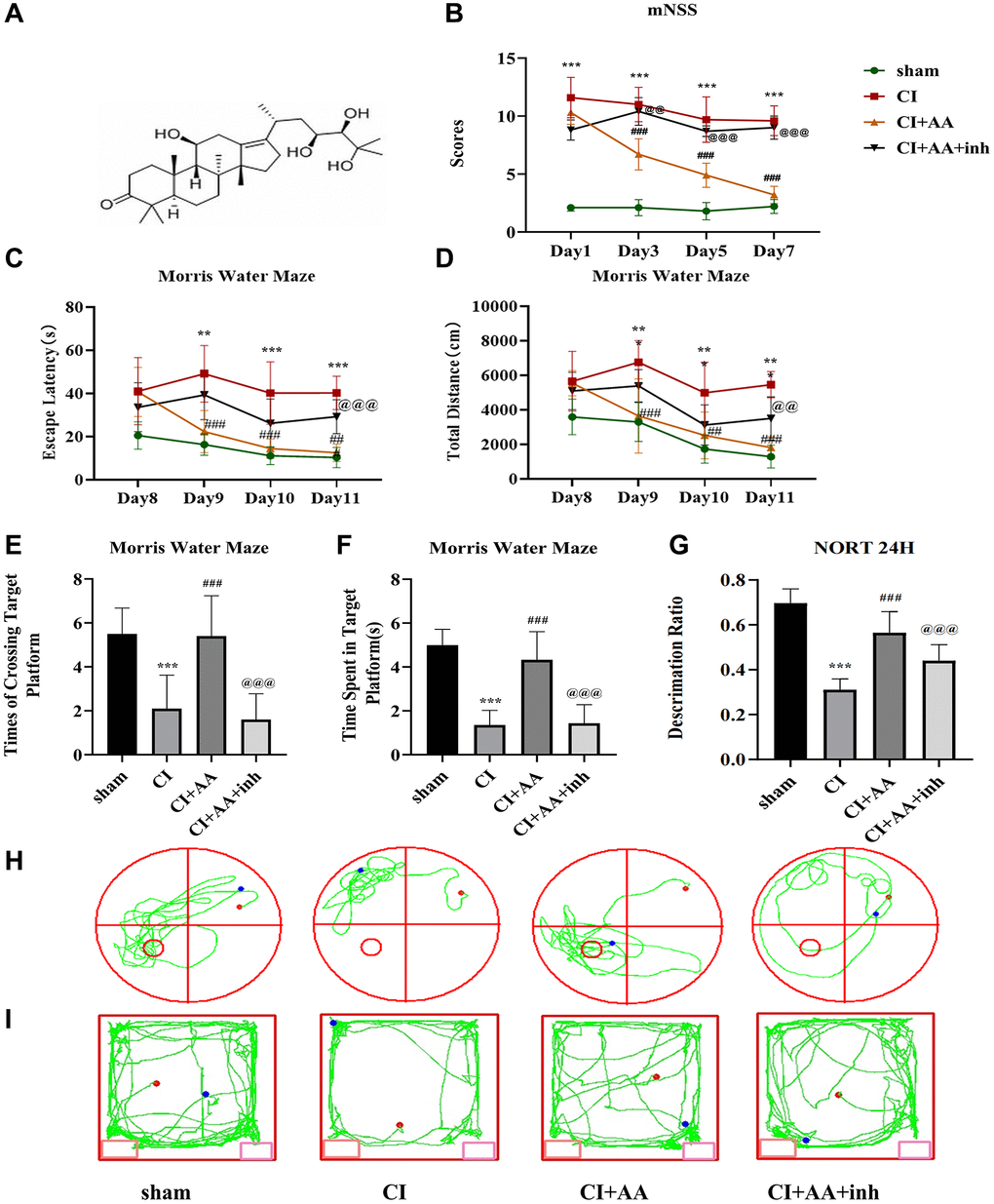 The recognition memory of mice was detected by NORT (Figure 1G). Compared with the sham group, the discrimination ratio in the CI group was significantly decreased (P < 0.001), increased in the CI+AA group (P < 0.001), and decreased in the CI+AA+inh group (P < 0.001). The trajectory diagram of the mice is shown in Figure 1I. The data above revealed that alisol A effectively alleviated cognitive impairment.