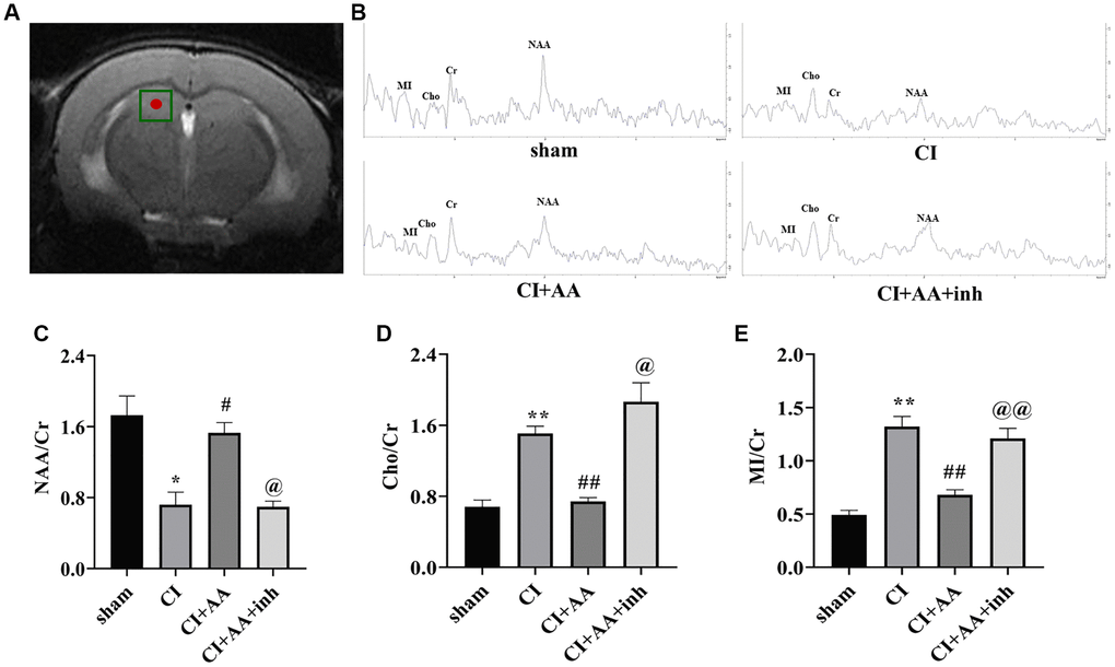 The relative levels of Cr, NAA, Cho and MI in the CA1 region of the hippocampus were detected by MRS (Figure 2A). Figure 2B shows a representative spectral image of the hippocampal CA1 region of mice. NAA is a specific biochemical marker to assess neuronal viability/integrity, and Cho and MI levels indicate information about glial metabolism [19]. The NAA/Cr ratio of the CI group was significantly reduced (P < 0.05), and the NAA/Cr ratio was increased by alisol A treatment (P < 0.05) and decreased by the AKT inhibitor (P < 0.05) (Figure 2C). The results indicated that alisol A treatment improved the destruction of neurons, while the effect was reversed by an AKT inhibitor. Compared with the sham group, Cho/Cr and MI/Cr ratios in the CI group increased with statistically significant (P < 0.01, P < 0.01). Alisol A decreased the ratios of Cho/Cr and MI/Cr (P < 0.01, P < 0.01), and the inhibitor reversed the results (P < 0.05, P < 0.01) (Figure 2D, 2E). MI and Cho have been considered putative glial markers, suggesting that alisol A reduced gliosis and improved neuronal/glial metabolism after CI.