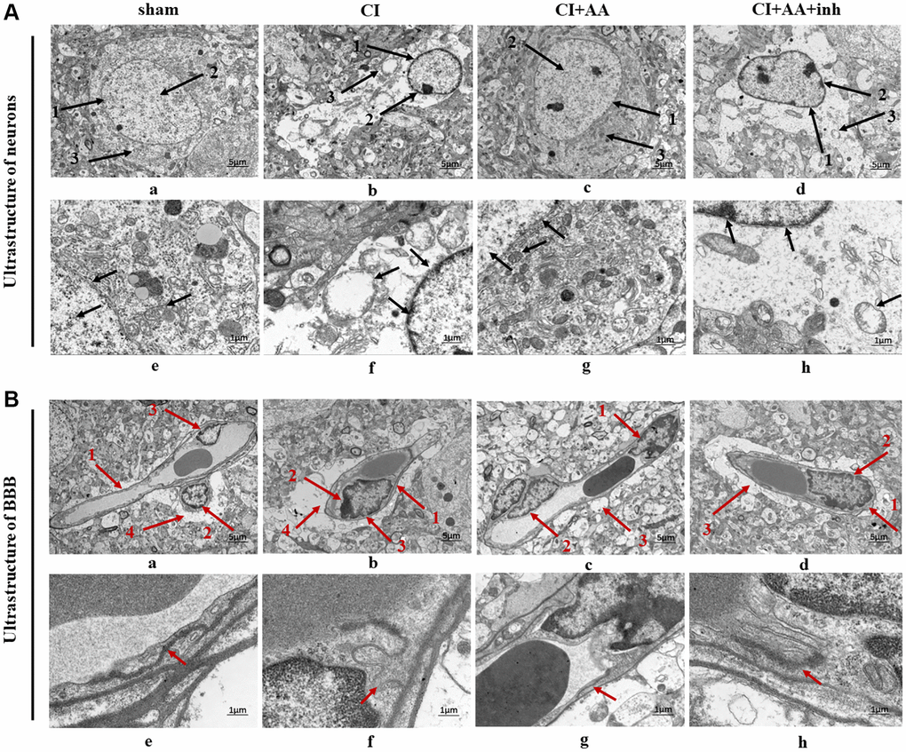 Neurons had an intact nuclear membrane structure and regular nuclear morphology in the sham group (Figure 3A (a, e)). Chromatin was distributed evenly within the nucleus. The nuclei with irregular shapes were slightly dissolved, and the chromatin showed condensation and edge aggregation and an incoherent nuclear membrane structure in the CI group (Figure 3A (b, f)). Moreover, some organelles were destroyed and even disappeared. The nuclear membrane was relatively intact, and the edge was clear after treatment with alisol A (Figure 3A (c, g)). In the inhibitor group (Figure 3A (d, h)), neurons with discontinuous and indistinct nuclear membrane structures had irregular morphology. Partial dissolution and disappearance of intracytoplasmic organelles can still be seen.
