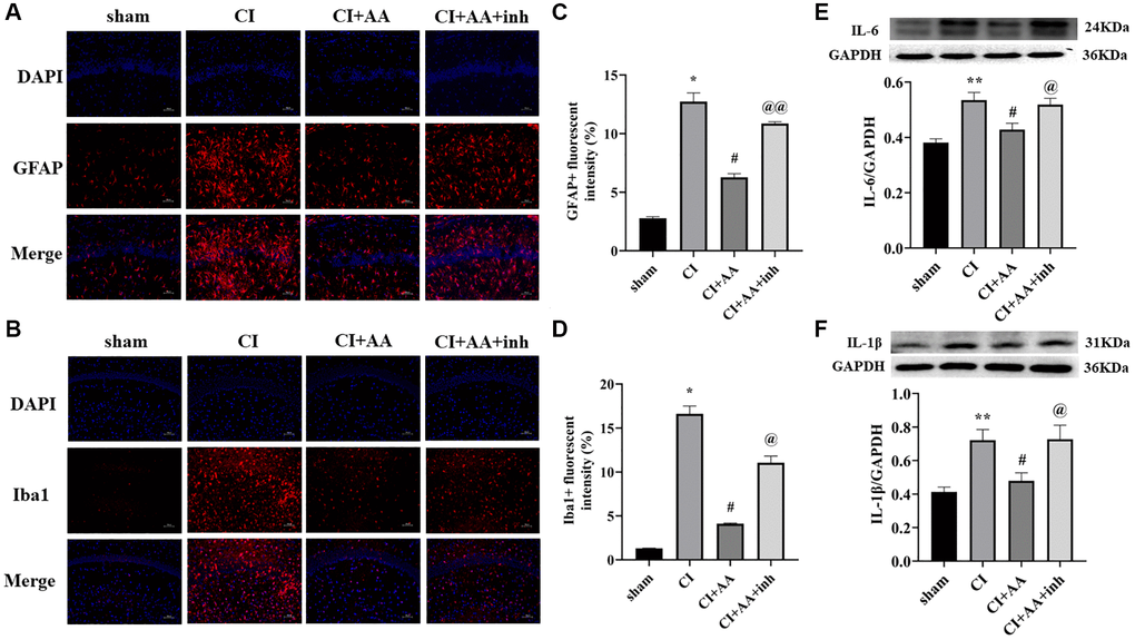 The number of glial cells increased after CI, inducing inflammation in the brain. Astrocytes and microglia (Figure 4A, 4C) were overactivated in the CI group compared with the sham group (P < 0.05, P < 0.05). Alisol A inhibited the overexpression of GFAP and Iba1 (P < 0.05, P < 0.05), and the AKT inhibitor restored the overactivation of GFAP and Iba1 (P < 0.01, P < 0.05) (Figure 4B, 4D). Overactivated glial cells produce proinflammatory factors that further damage brain injury. The expression of IL-6 and IL-1β was increased in the CI group (P < 0.01, P < 0.01). Alisol A markedly reduced IL-6 and IL-1β levels (P < 0.05, P < 0.05). Compared with alisol A treatment, the AKT inhibitor increased the expression of IL-6 and IL-1β (P < 0.05, P < 0.05) (Figure 4E, 4F). The results revealed that alisol A inhibited glial activation and reduced the production of inflammatory factors.